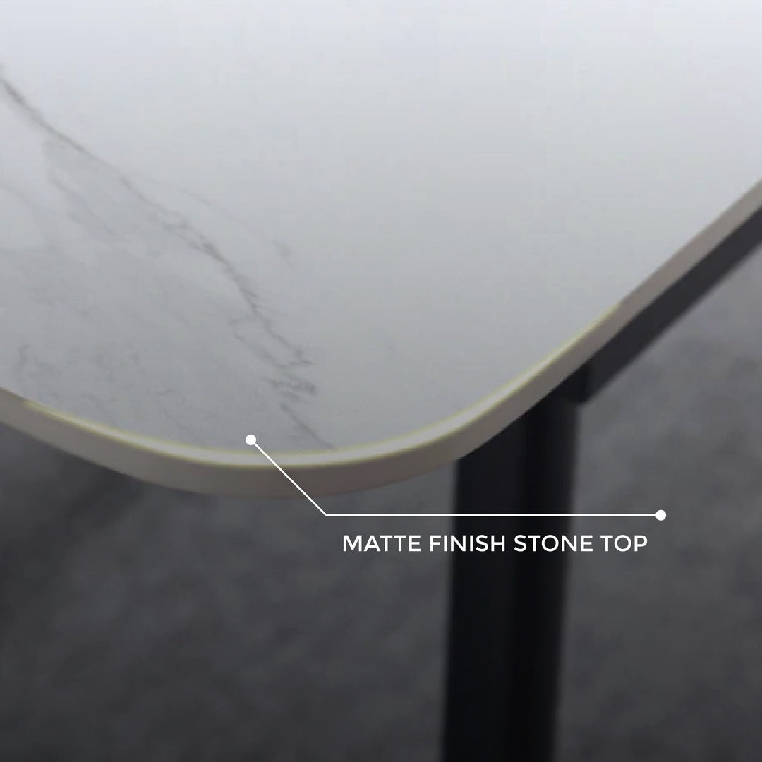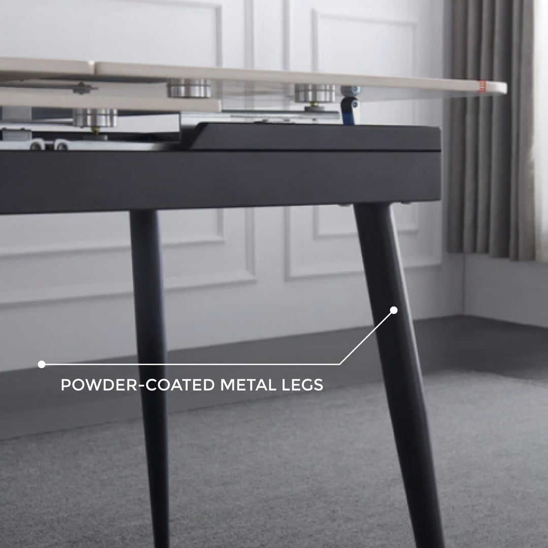 The Aria Extendable Dining Table is a great choice to maximize space. It adapts effortlessly to your needs, offering a compact setup for daily use and extra space when needed. Expertly designed with a sintered stone top, each piece features unique color and pattern variations. The heat-resistant top is reinforced with metal frame legs for a smooth, contemporary finish.