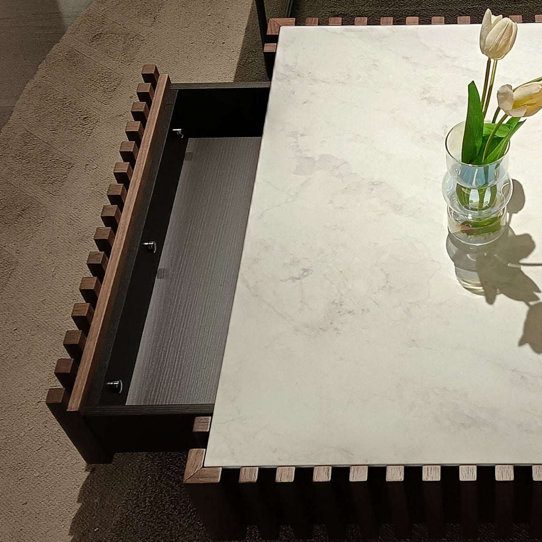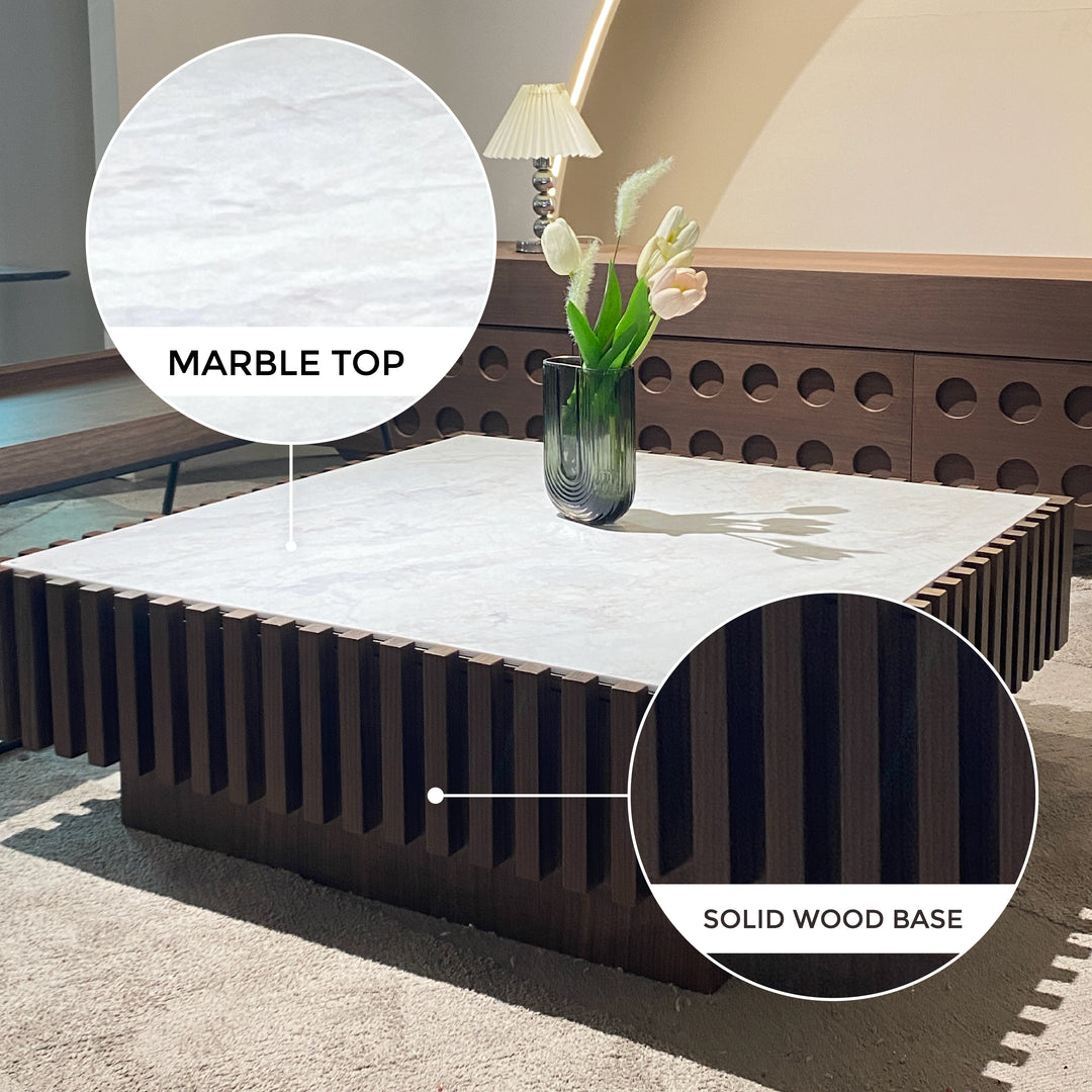 - Materials: Premium marble top and solid wood base with slatted detailing.
