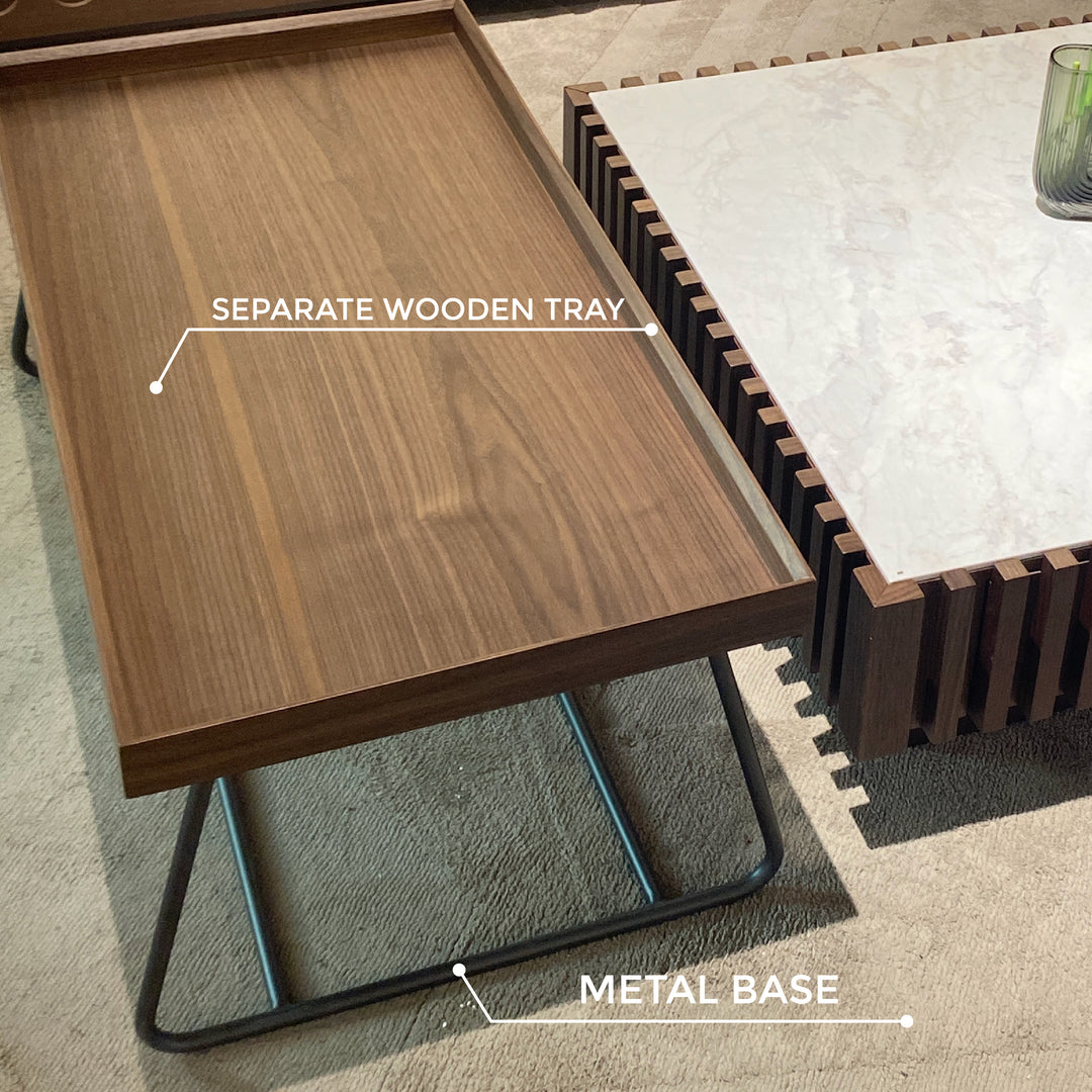 The Aspen Duo Modern Coffee Table features a graceful marble top paired with a wooden frame with ribbed detailing. It also includes a separable wooden tray table with a metal base, creating a dual-level design perfect for versatile serving and display.