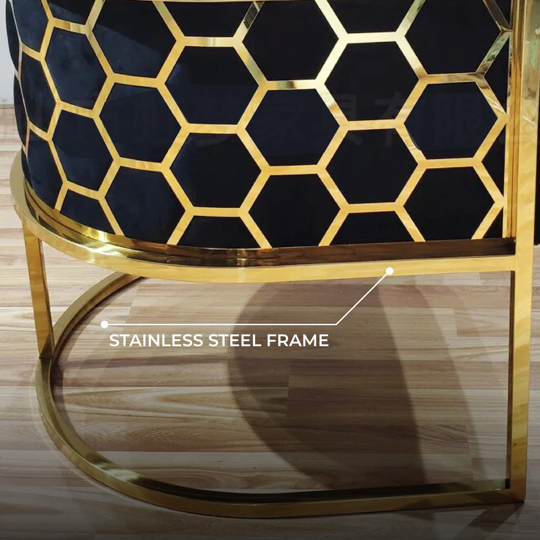 The Honeycomb Dining Chair is renowned for its unique honeycomb-designed back with a brushed gold finish that makes it even more appealing. Adding luxury to its appearance, the blue velvet upholstery offers comfort. This chair lasts for years with its strong stainless steel legs with brushed gold and a unique curved pedestal.