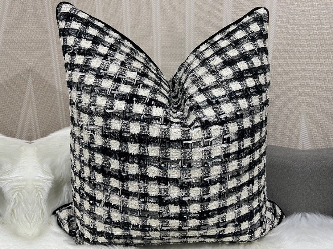 - Premium textured tweed fabric with a striking black and white checkered design.