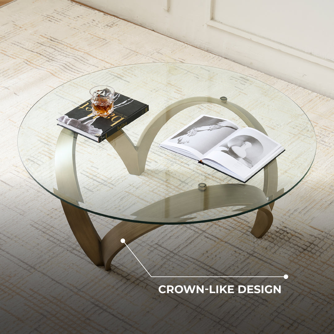 The Alberta Glass Top Coffee Table is an exquisite piece featuring a 12mm round clear glass top with beveled edges. This transparent tabletop offers an unobstructed view of its beautiful powder coated metal base. With its iconic crown-like design and gold finish, this Scandinavian coffee table brings outstanding artistry to your living room.
