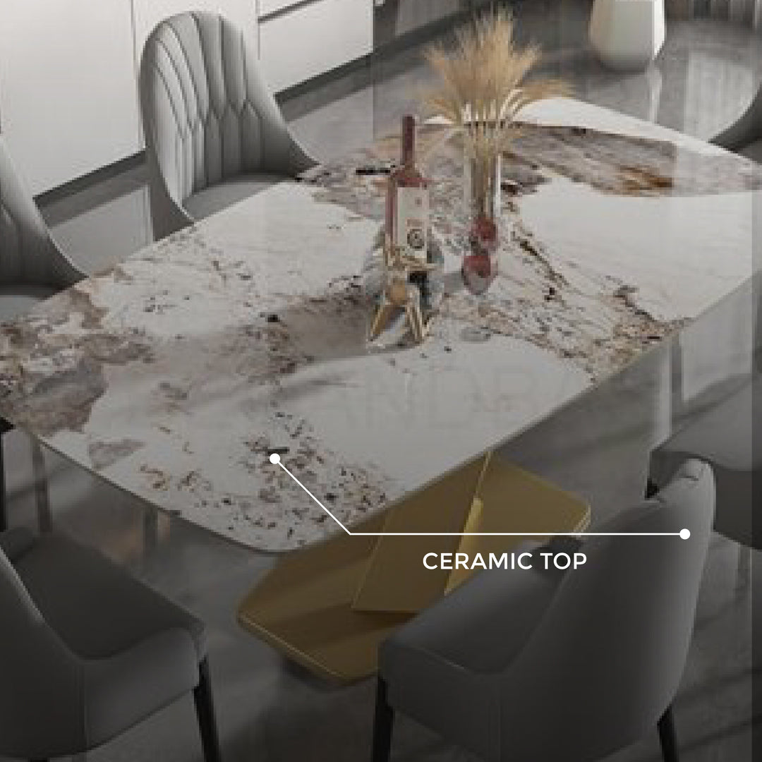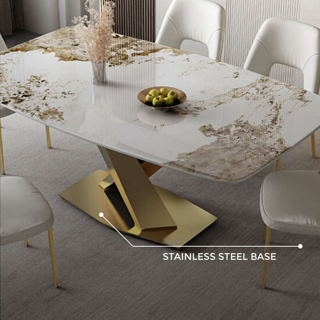 The Harvey Sintered Stone Dining Table is a sleek, durable, and low-maintenance dining table that is the perfect choice for smaller spaces. Expertly crafted with a sintered stone top, it features unique colour and patterns for a distinctive look. The heat-resistant sintered stone top is supported by a metal cross base with a powder-coated finish, creating a smooth, modern aesthetic.