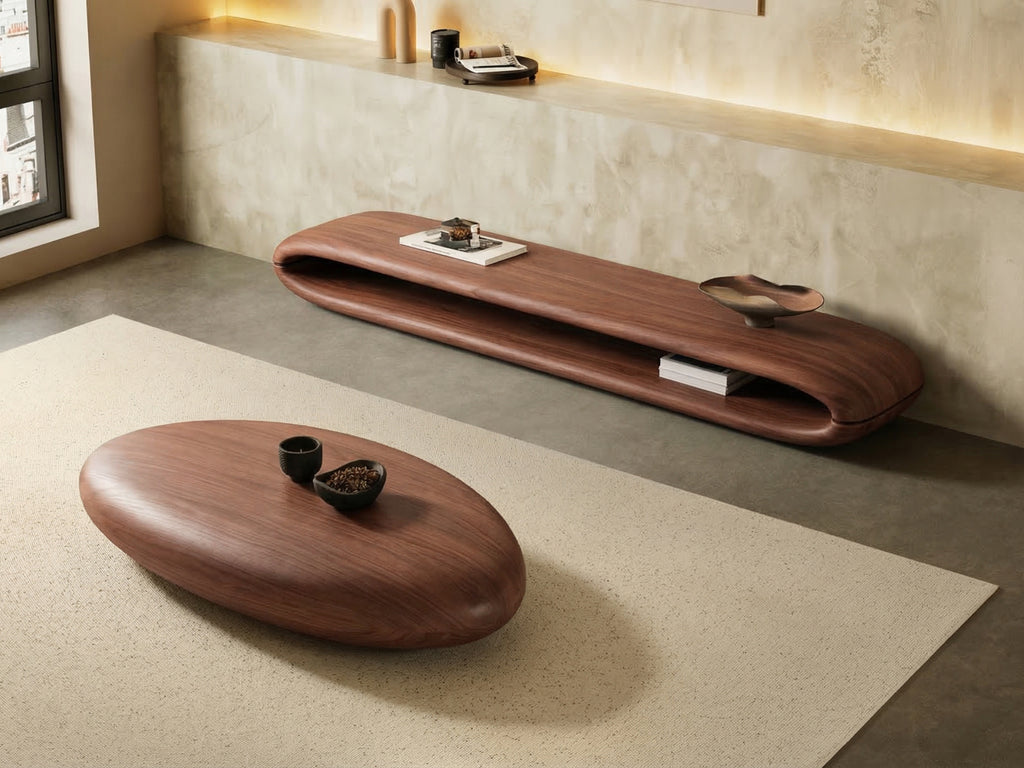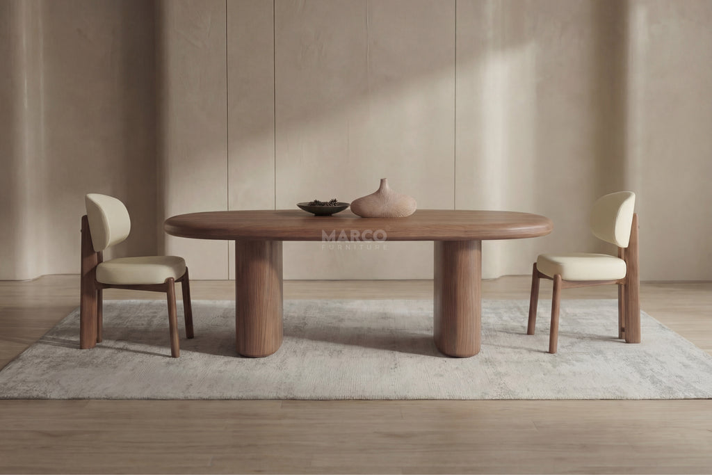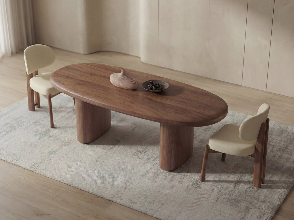 A dining table that feels right the moment you see it. The soft oval shape, rich walnut tone, and solid base bring warmth and balance to your dining space—built for everyday meals and long conversations.