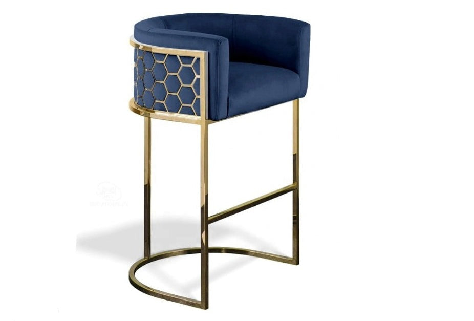The Honeycomb Bar Stool features an intertwined honeycomb back pattern crafted from luxurious gold stainless steel, which complements modern spaces. Its blue velvet upholstery, combined with plush multi-density foam, provides a soft and supportive seat. Supported by a gold stainless steel base, this royal chair is a perfect addition to contemporary bars or dining rooms.