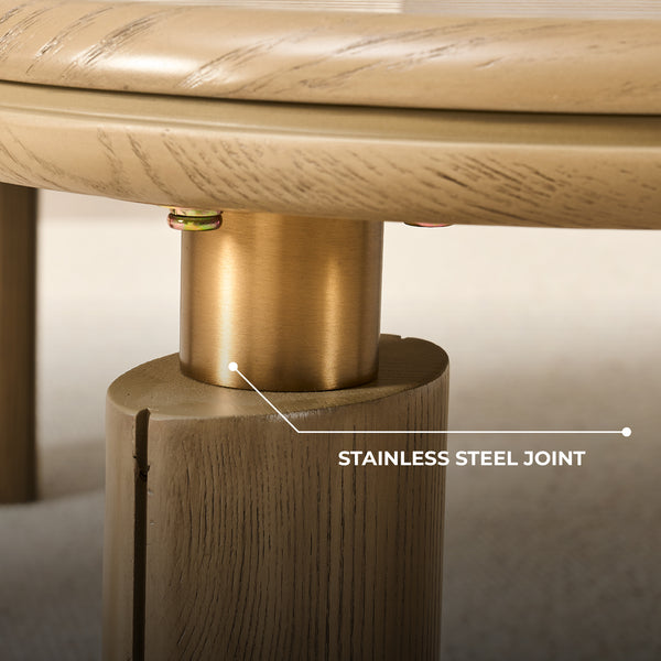 Stainless steel joints in a brushed gold finish connect the legs to the tabletop, adding a subtle contrast to the natural wood grain.