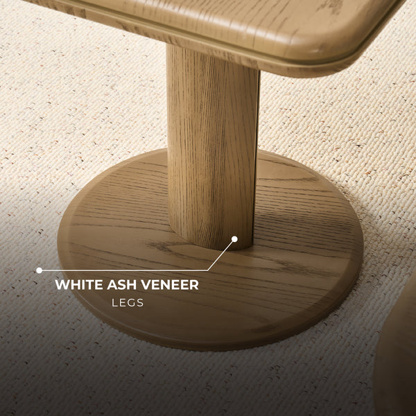 The Bella Tavola Ash Veneer Coffee Table, inspired by traditional styles, can serve as a coffee table or a display space for decorative pieces. This low Japandi-style coffee table is made from crown cut white ash veneer, which showcases a distinctive flowing grain pattern in light and warm tones. Its veneer legs are connected to the tabletop through stainless steel joints, giving the coffee table a glossy shine.