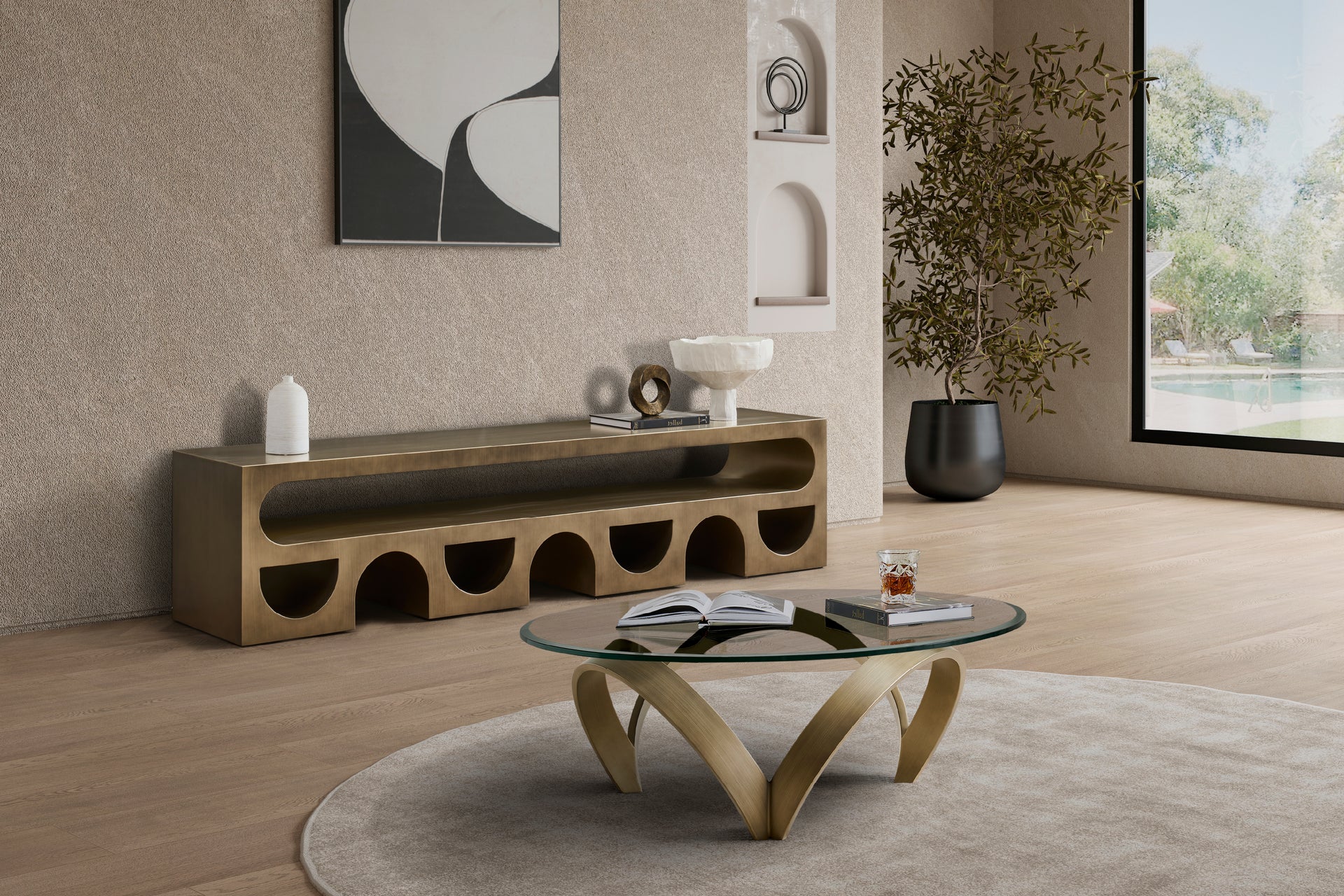 The Alberta Glass Top Coffee Table is an exquisite piece featuring a 12mm round clear glass top with beveled edges. This transparent tabletop offers an unobstructed view of its beautiful powder coated metal base. With its iconic crown-like design and gold finish, this Scandinavian coffee table brings outstanding artistry to your living room.
