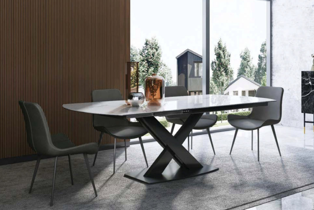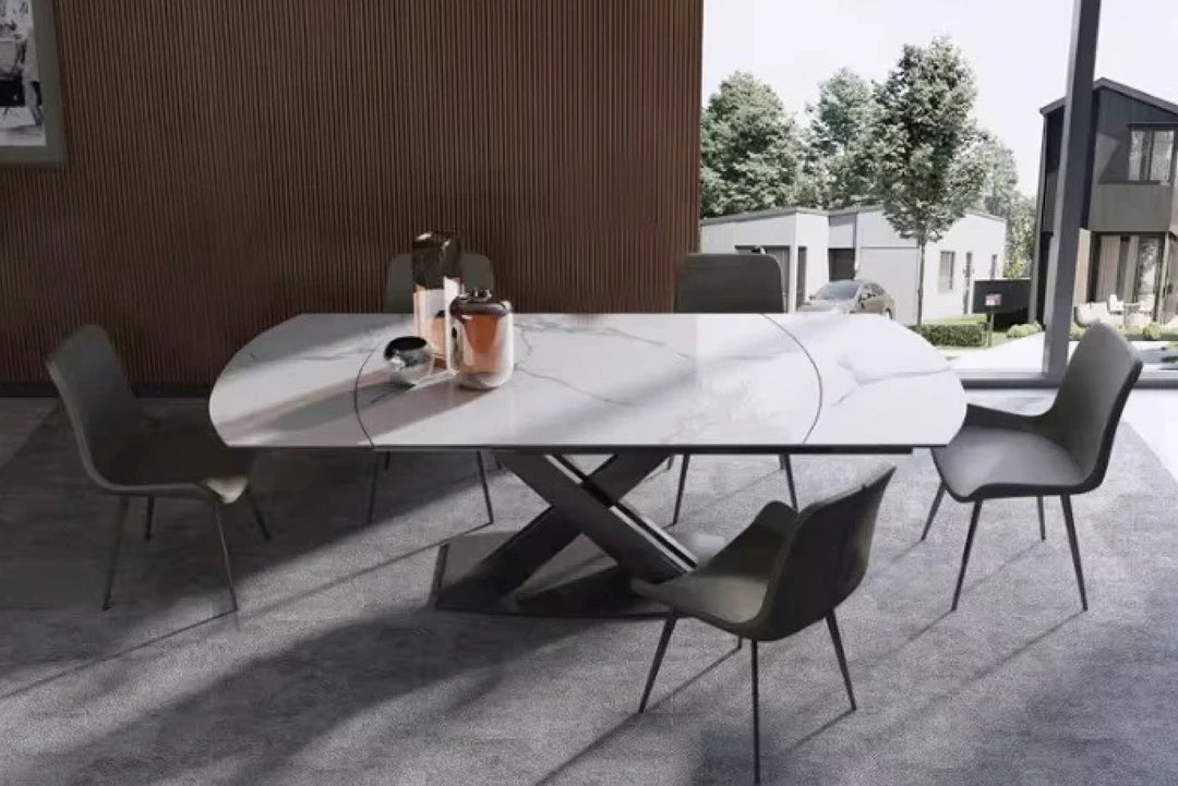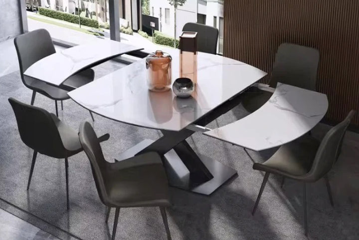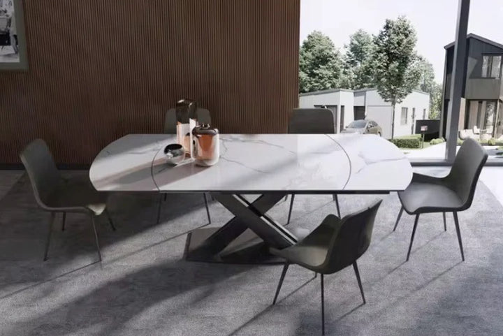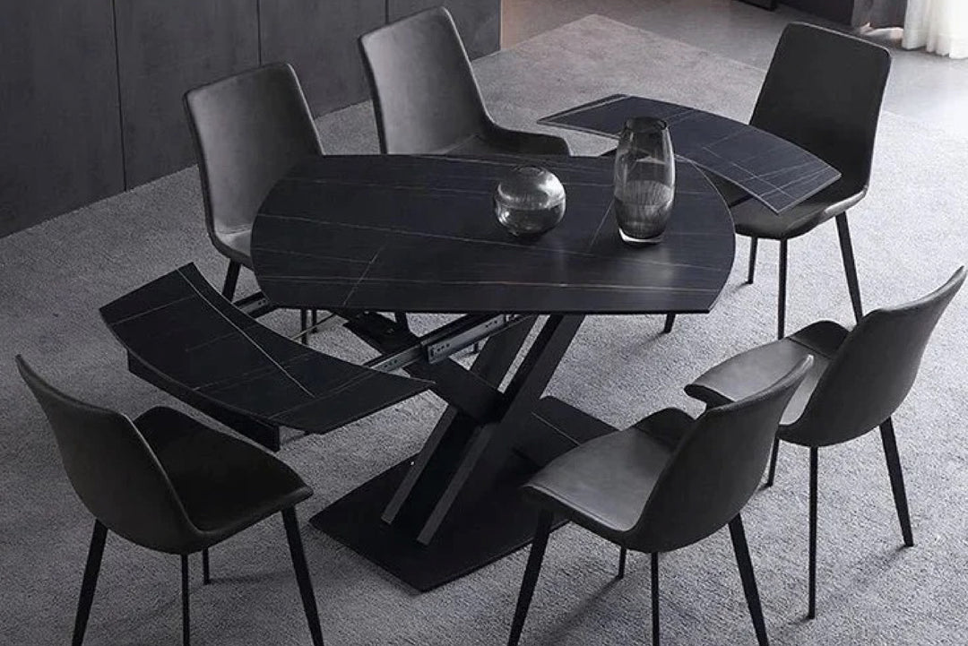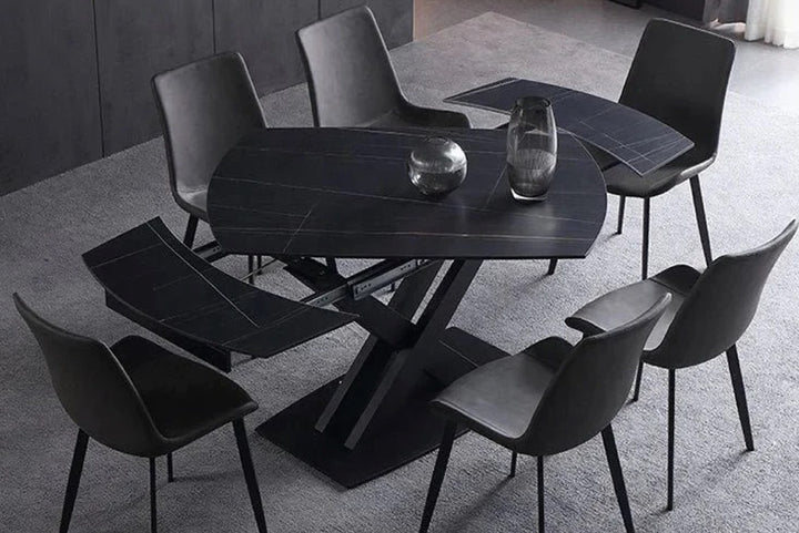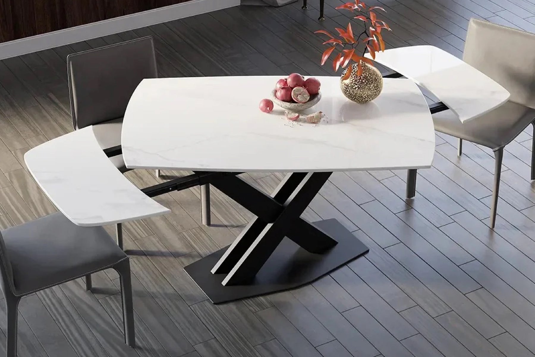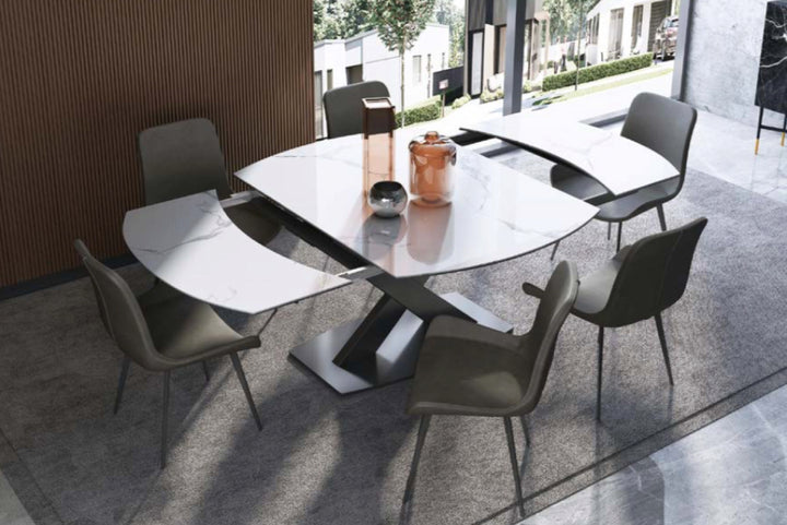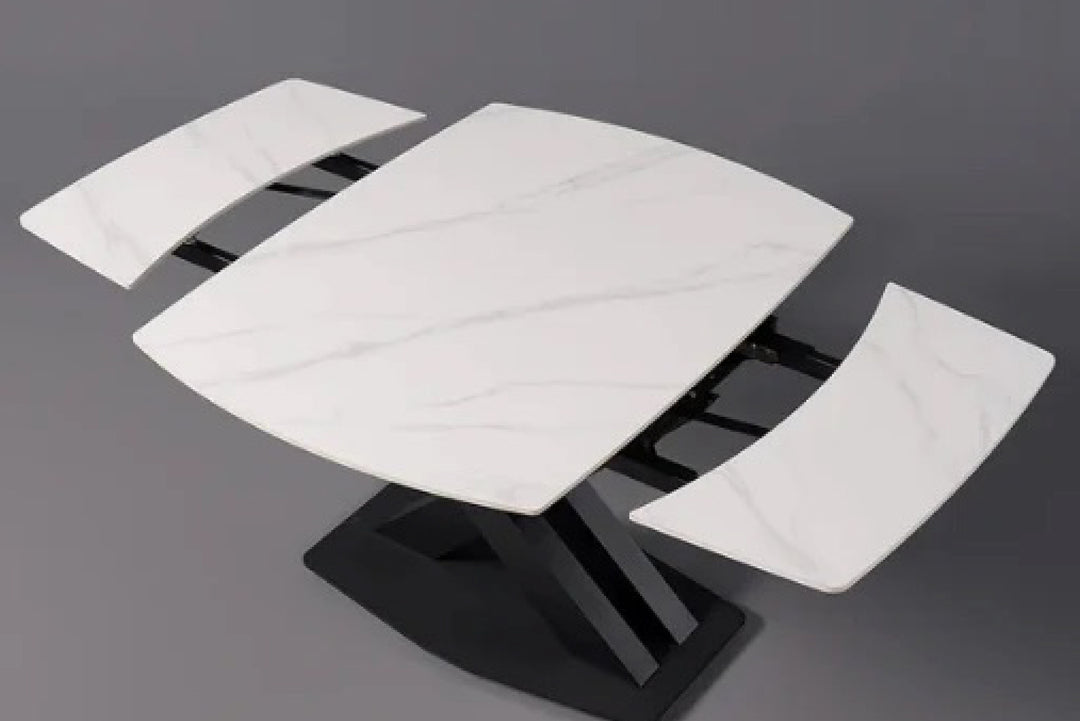 The Eclipse Extendable Sintered Stone Dining Table provides a modern dining experience. Its beautiful, clean-lined white sintered stone top features a stunning yet easy-to-maintain surface. The matte black powder-coated steel frame provides a bold and sturdy foundation to this table. Equipped with a swivel mechanism, the table effortlessly adjusts to suit your needs.