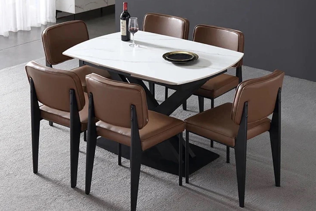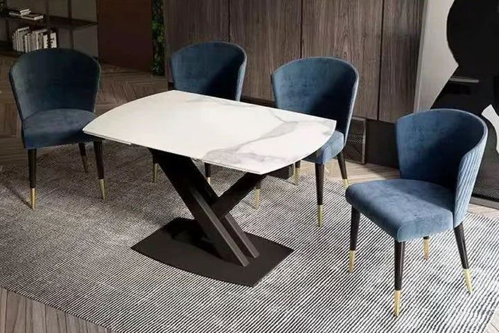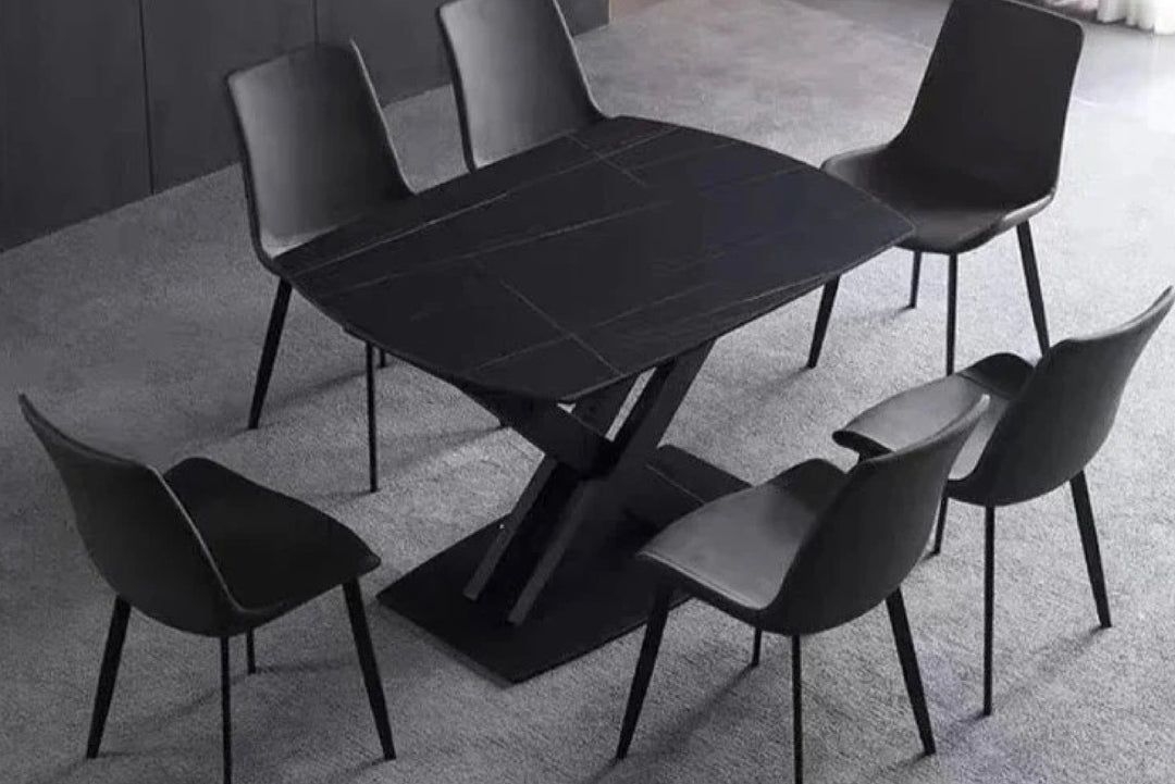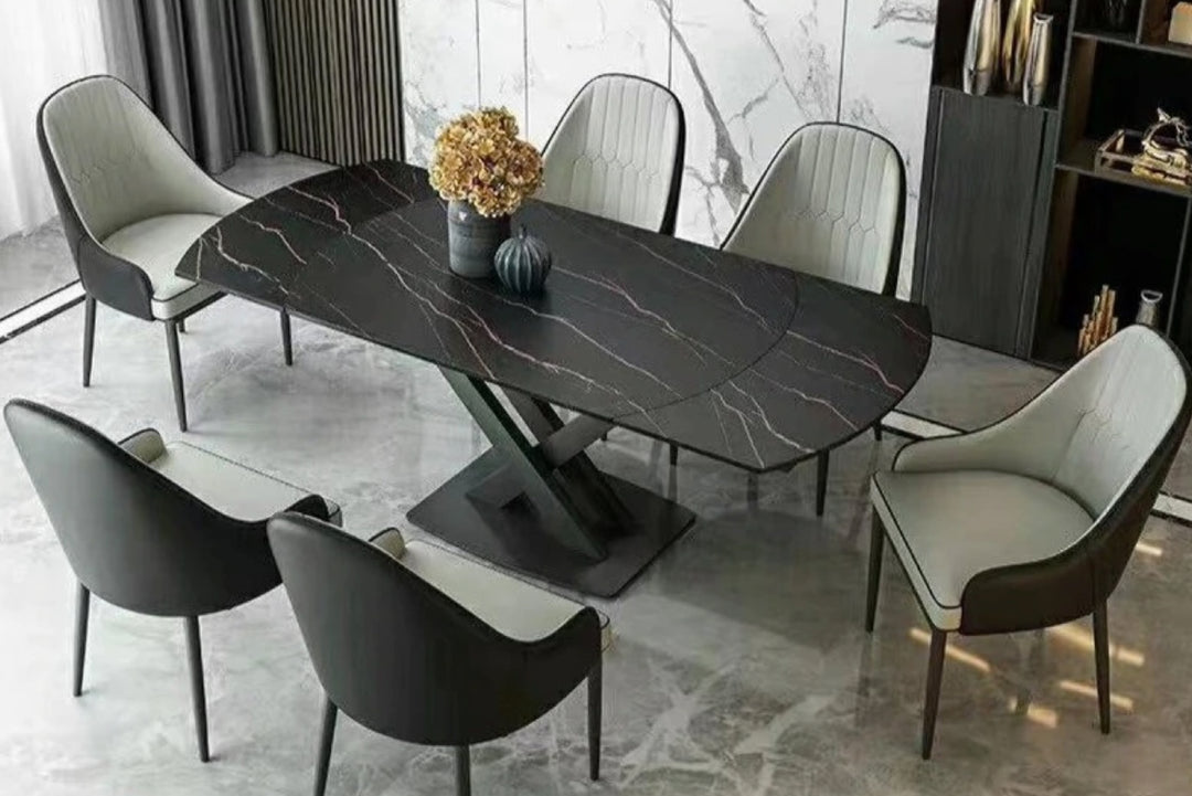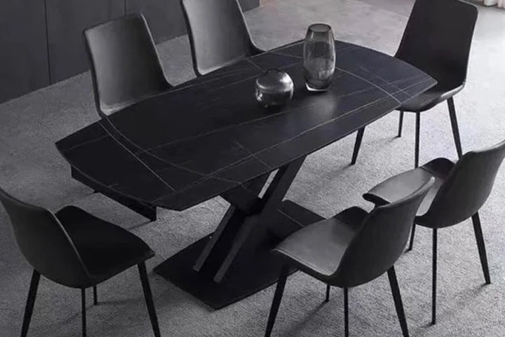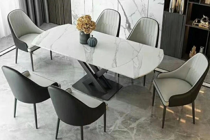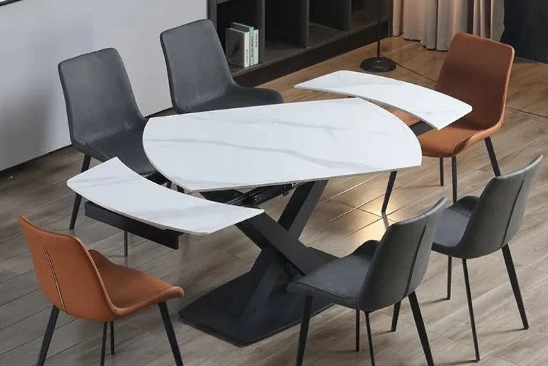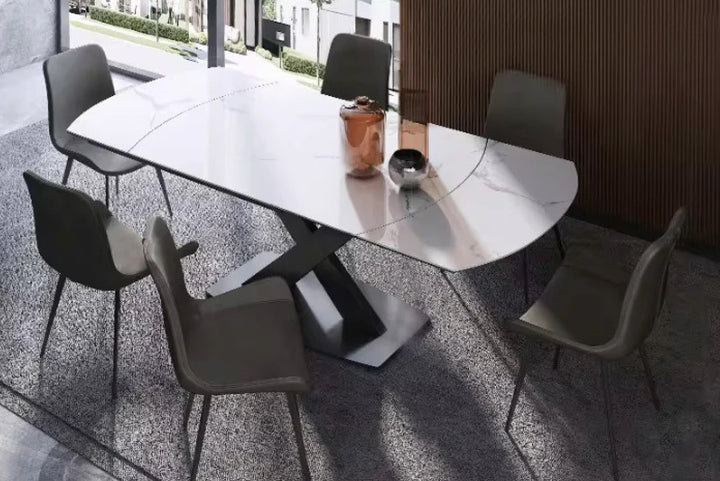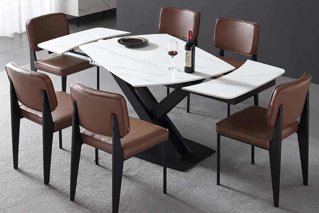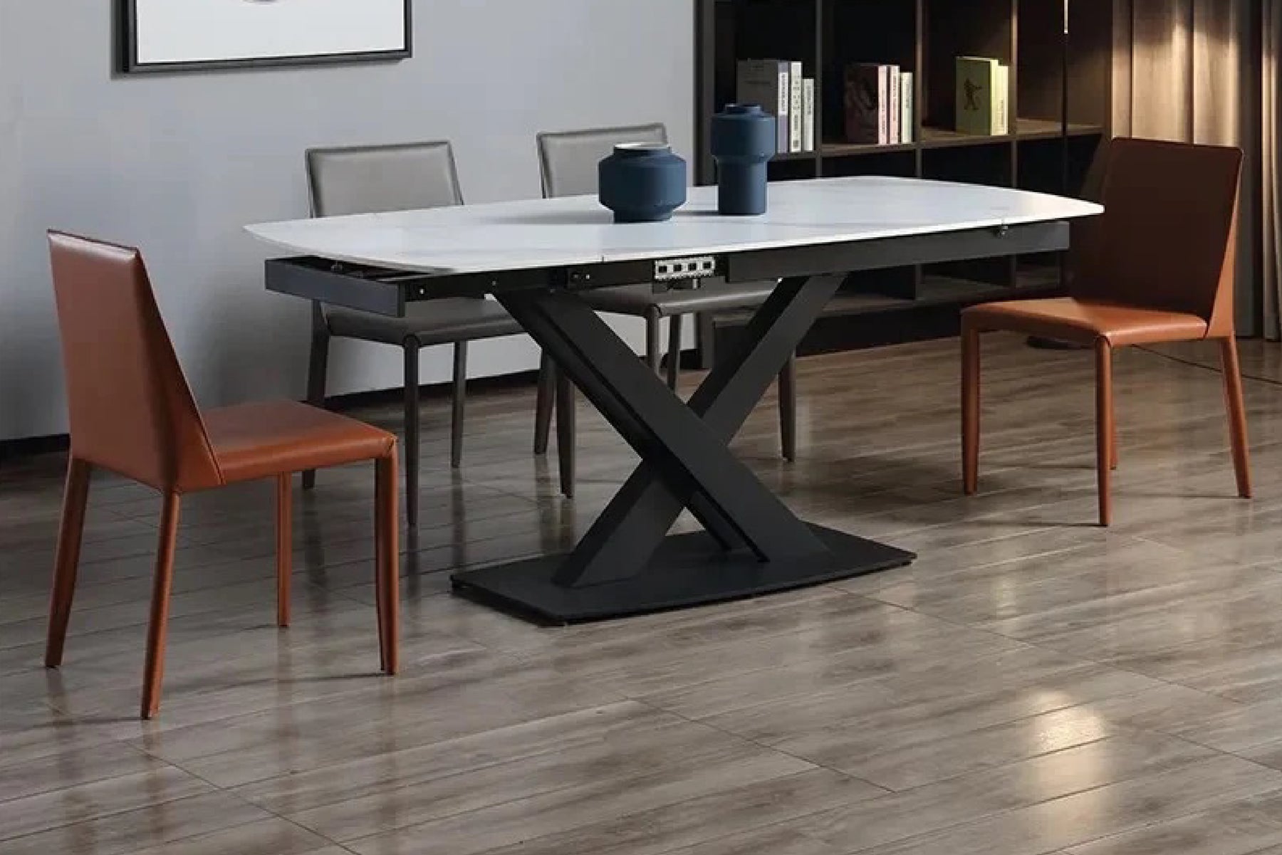 The Eclipse Extendable Sintered Stone Dining Table provides a modern dining experience. Its beautiful, clean-lined white sintered stone top features a stunning yet easy-to-maintain surface. The matte black powder-coated steel frame provides a bold and sturdy foundation to this table. Equipped with a swivel mechanism, the table effortlessly adjusts to suit your needs.
