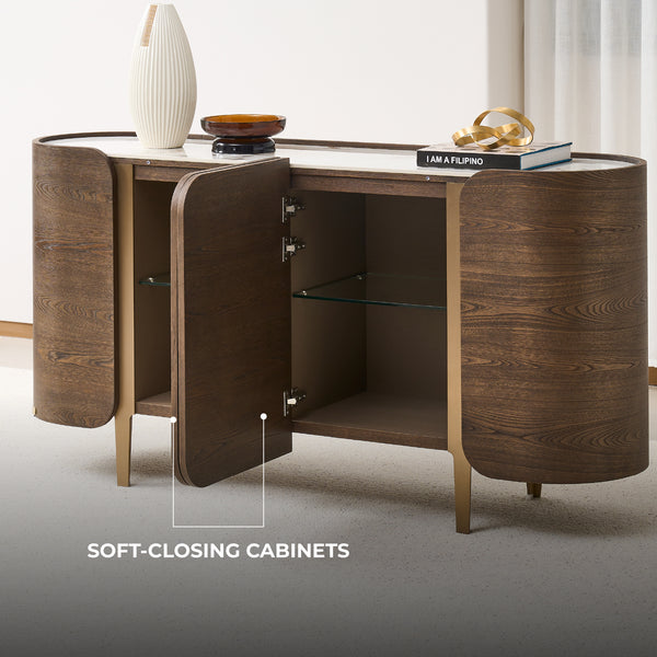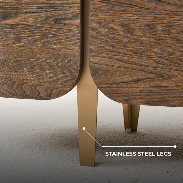 Stainless steel legs gracefully merge into the frame, creating a smooth design that gives the buffet a refined feel.
