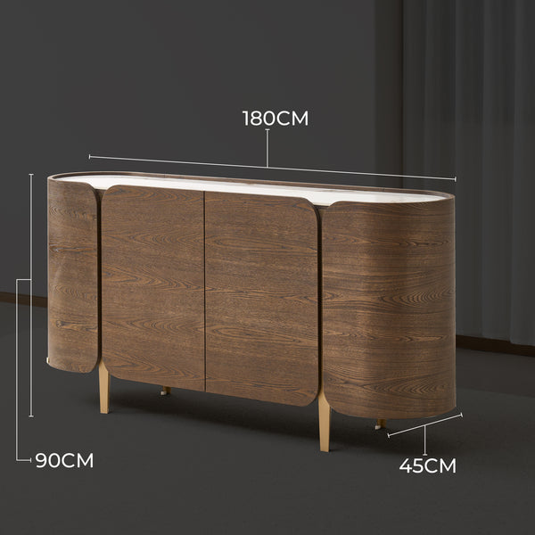 The Mont Blanc Sintered Stone Sideboard Cabinet features a gracefully curved frame with fine details. Crafted from natural elm veneer and MDF, its rich texture adds warmth to any room. The Pandora sintered stone top, with its distinctive pattern, provides a perfect spot to showcase your vases and magazines. This buffet also includes two spacious cabinets with wooden doors for added storage space.