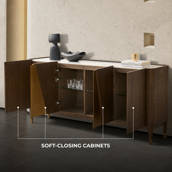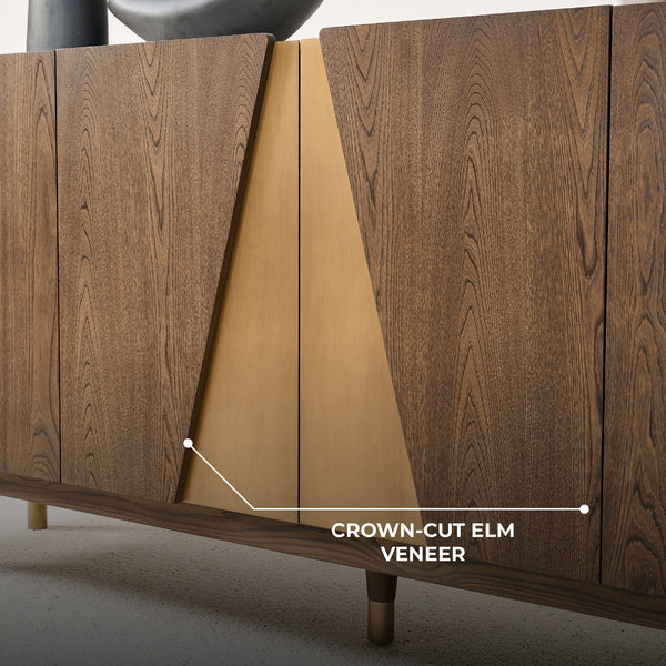 The Olmo Fiorito Sintered Stone Sideboard Cabinet features a graceful design, perfect for modern interiors. This sideboard features a sintered stone top, paired with a crown-cut elm veneer frame in a toffee-brown colour. This buffet stands on firm elm veneer legs with stainless steel caps, offering both stability and a subtle modern accent. Its four soft-close cabinets make this buffet a perfect spot to tuck away living room or dining room essentials.