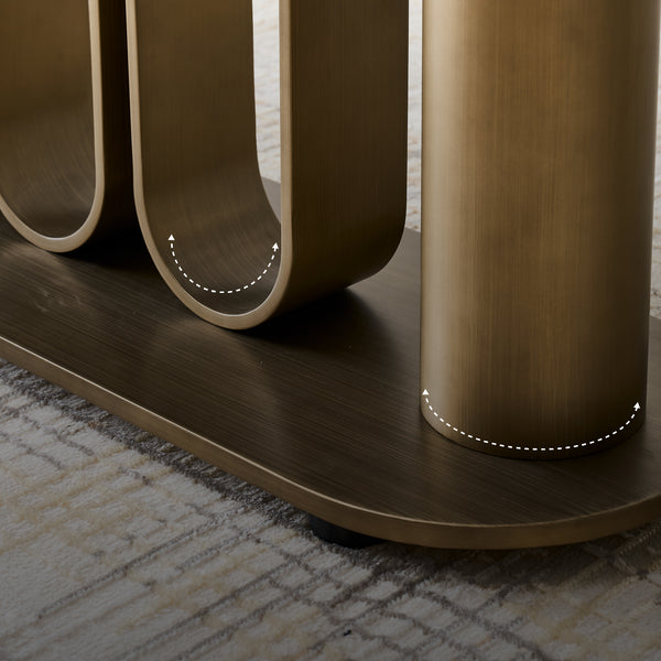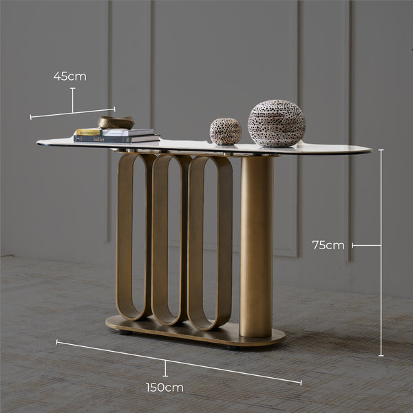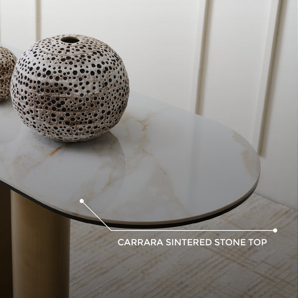 The Catalina Sintered Stone Console Table, with its stylized elements - colour, design, and texture - is a stunning addition to any living room. The royal tabletop of this hallway table features Carrara Sintered Stone and combined glass, exuding luxury at its finest. Paired with powder-coated metal base in gold, this narrow console table becomes a powerful sculptural expression.