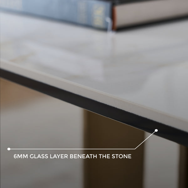 - Tabletop Material: 6mm Carrara Sintered Stone combined with 5mm glass
