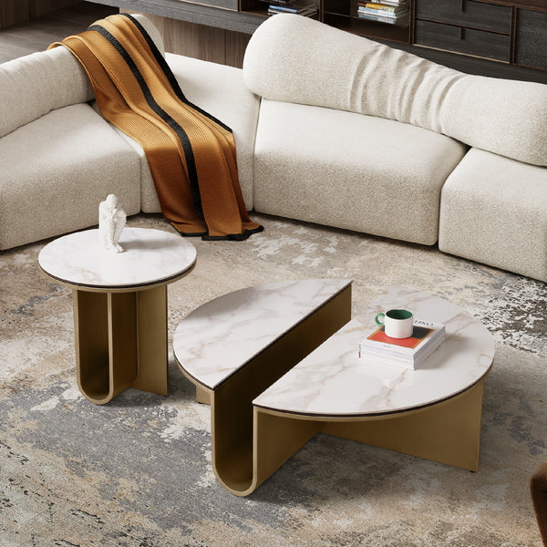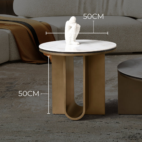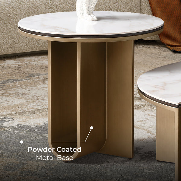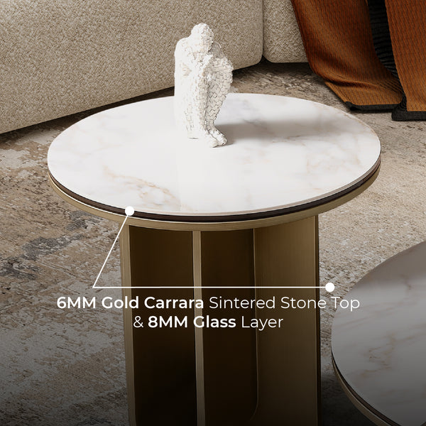 The Catalina Corner Table is a unique piece, featuring a Gold Carrara Sintered Stone top as a display space. Styled with beautiful gold metal legs, this end table is not just a luxury addition to your hallway and living room but also durable enough to serve for years to come.