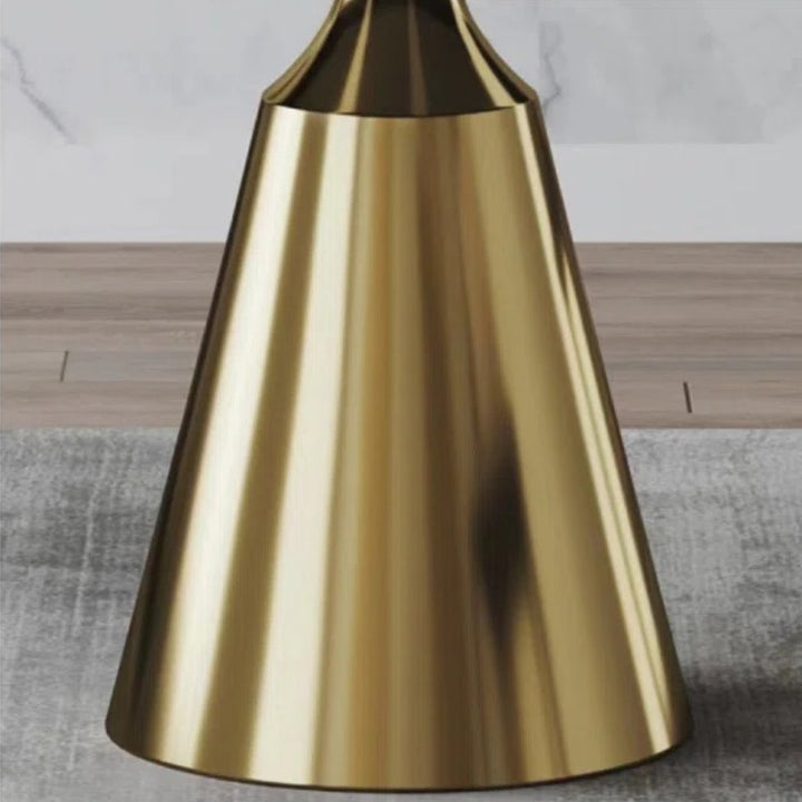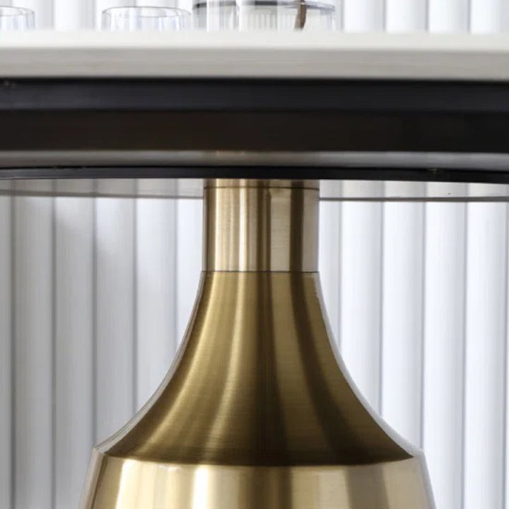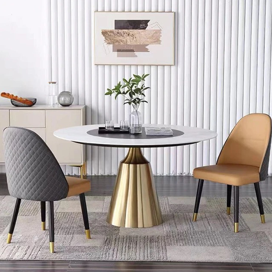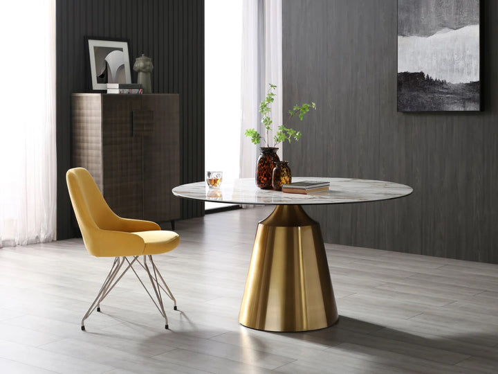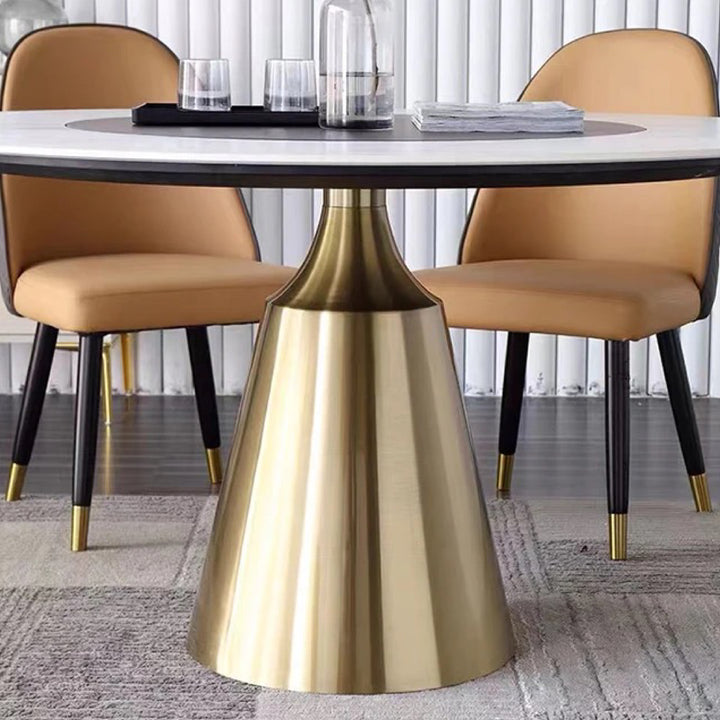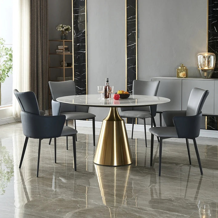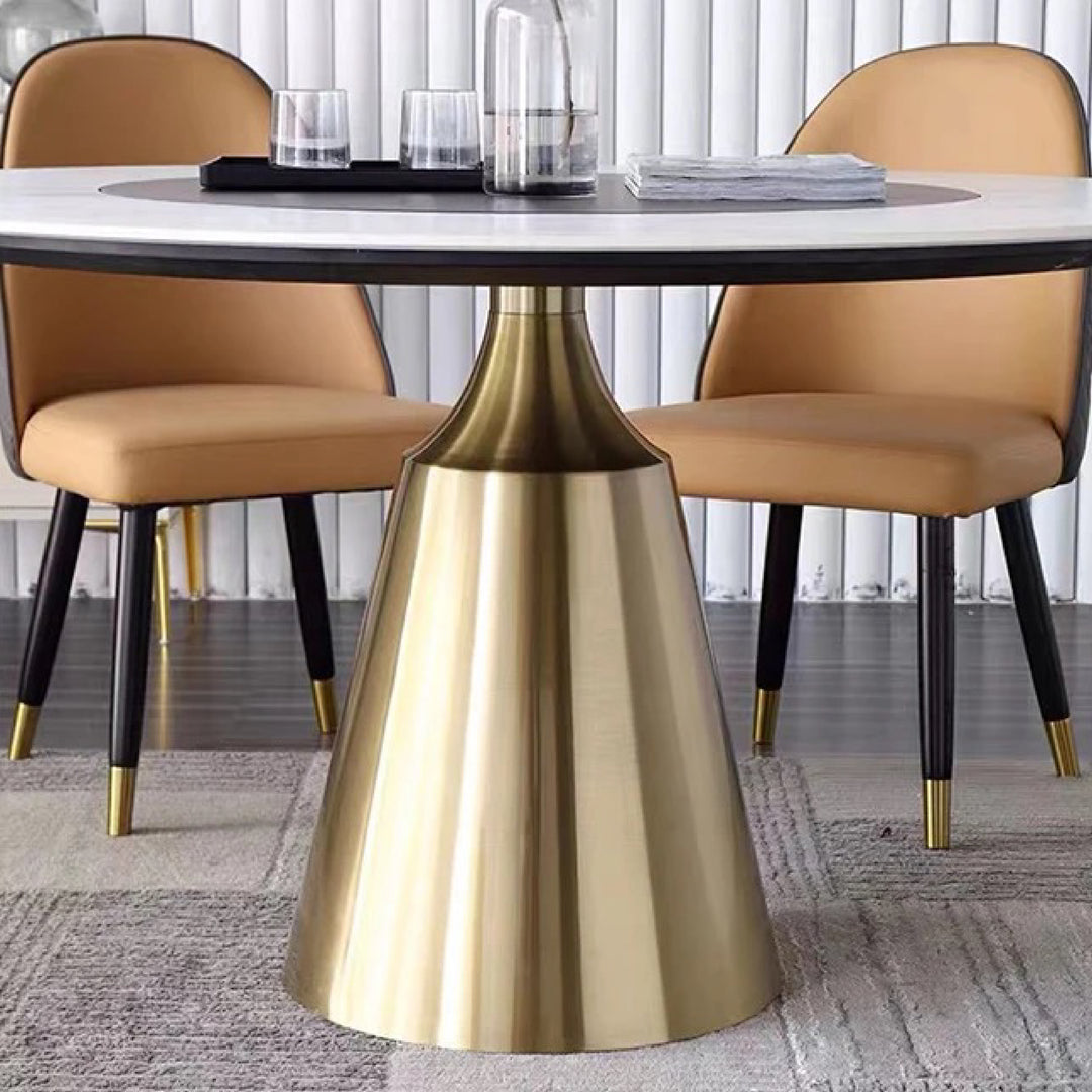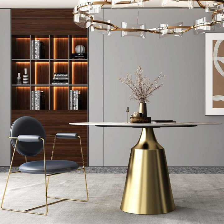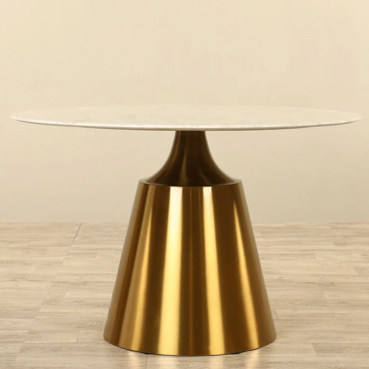 The Amara Pedestal Marble Dining Table brings a modern edge to your dining room. Its round marble top features unique veining, offering both visual appeal and long-lasting quality. The round stainless steel pedestal base, finished in gold, offers sturdy support to the table in a contemporary style. It also has a non-marking ring to protect the flooring.