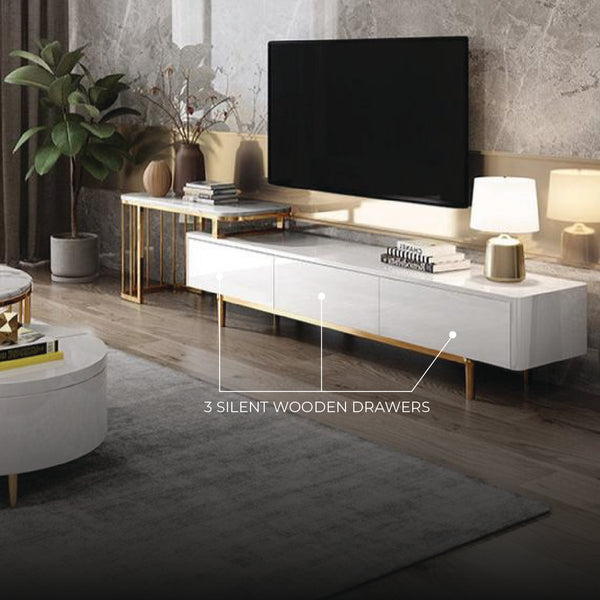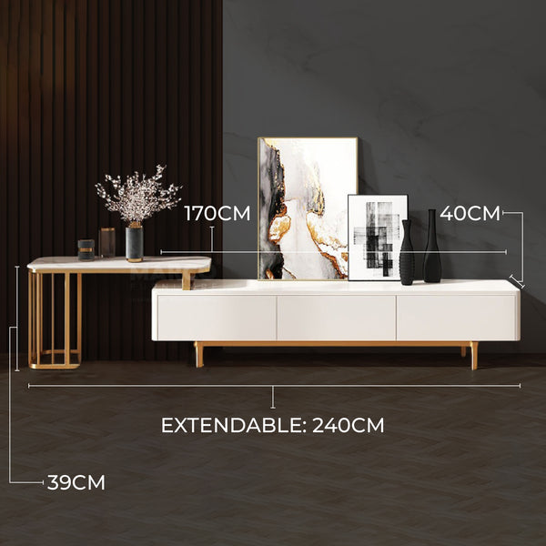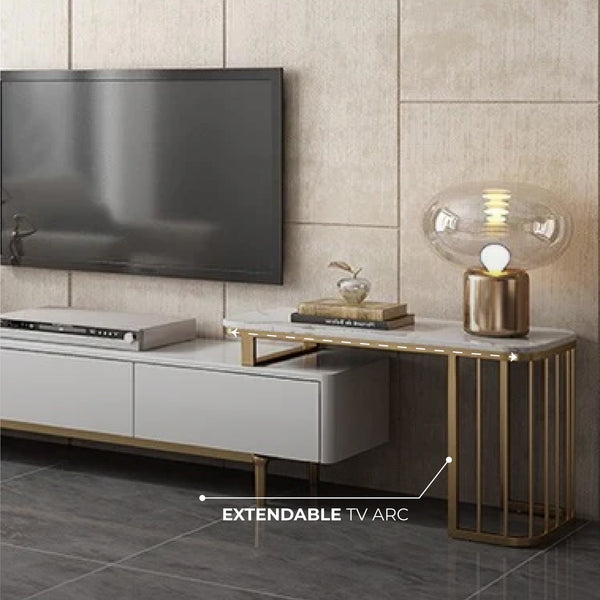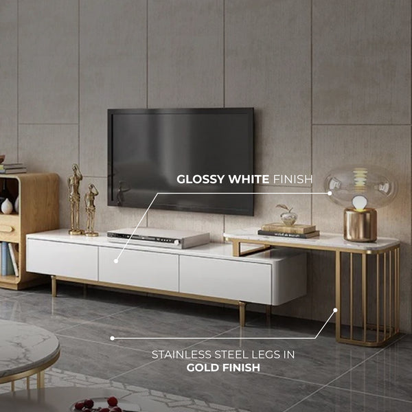 Milan Extendable TV Unit with Marble Extension and Stainless Steel Legs