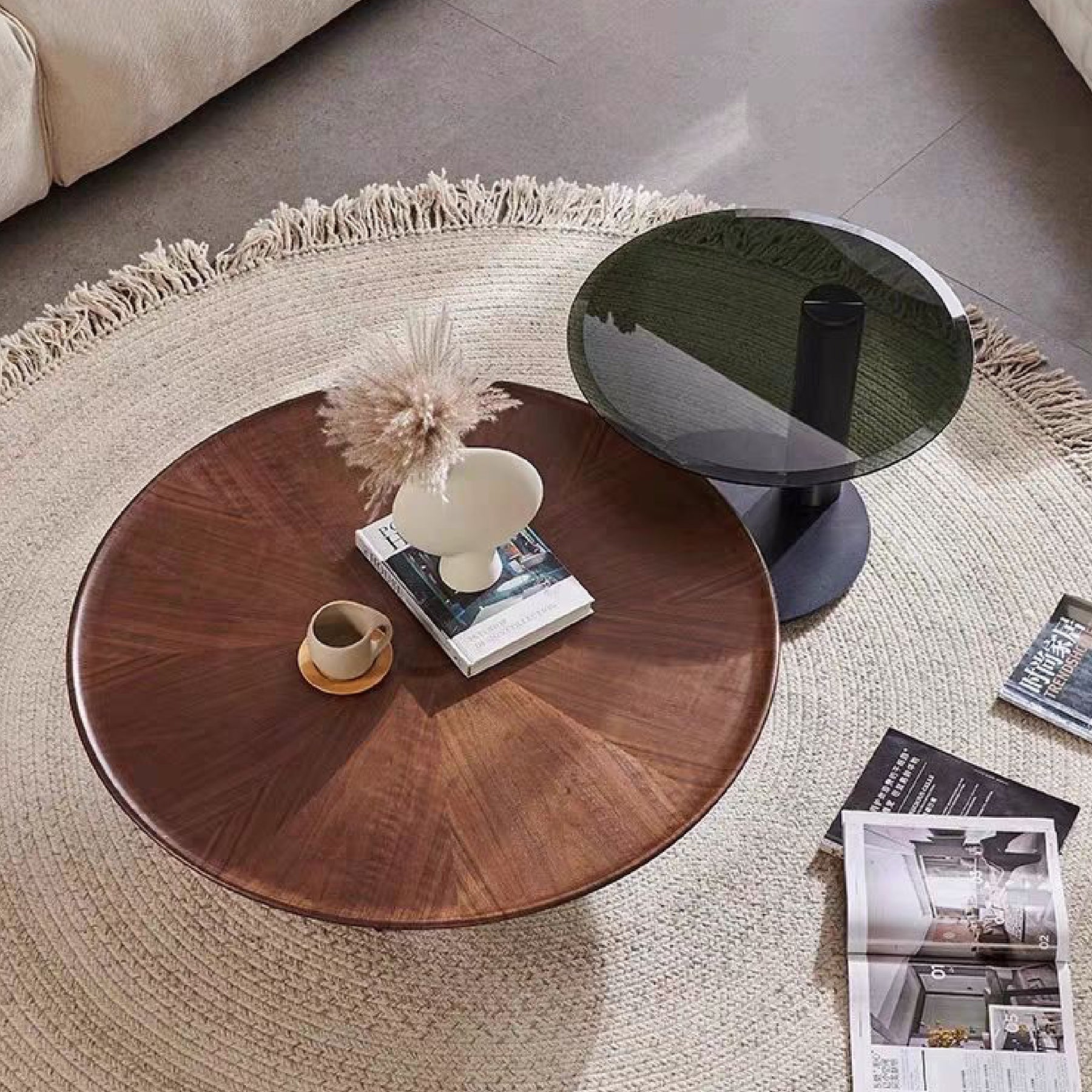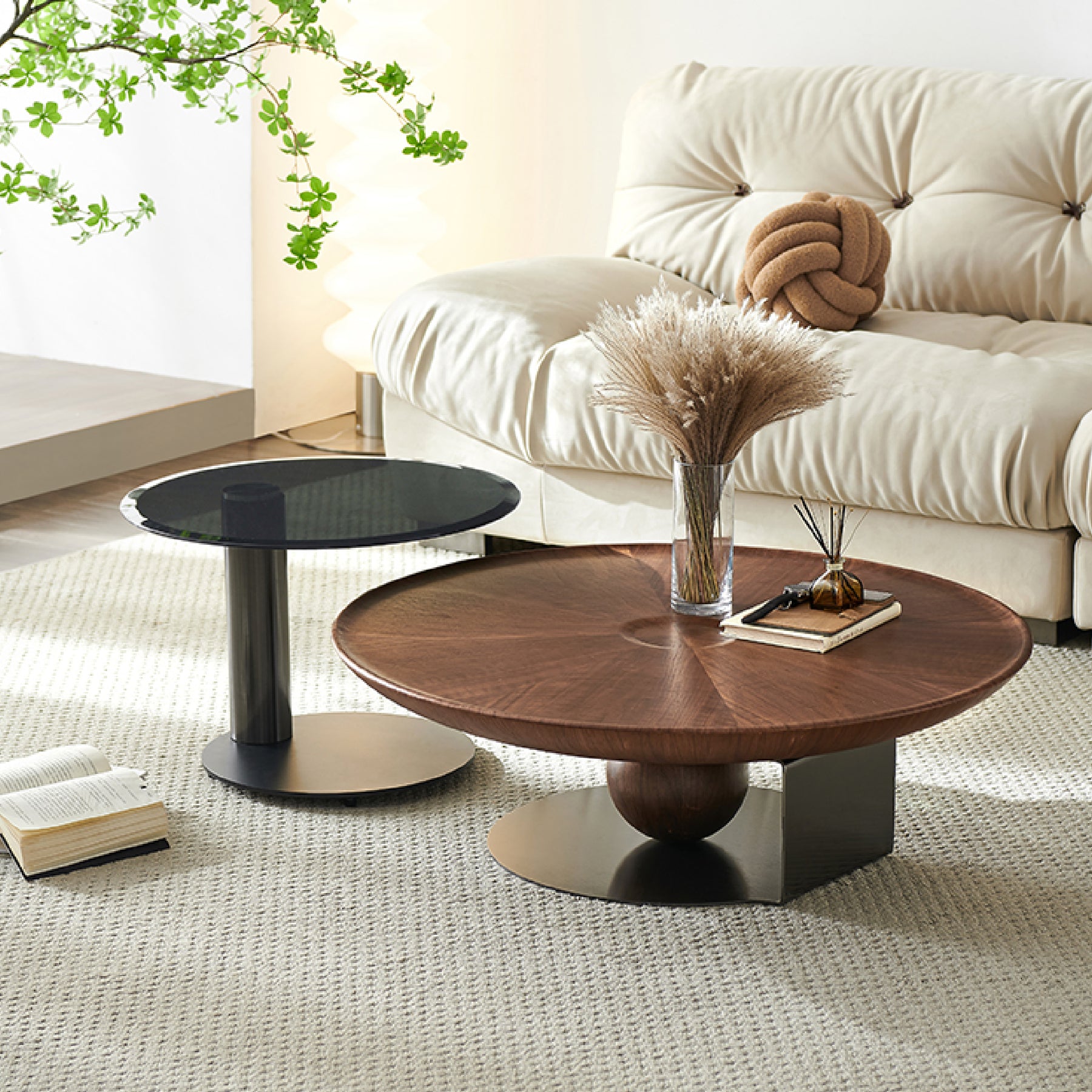 This gorgeous Amazon coffee table features a stained and varnished tabletop in a rich walnut color. The base is finished in a titanium color, showcasing distinctive and eye-catching details. The side table features a tempered glass top, beautifully set on a sturdy titanium base, creating a striking contrast in design and material.