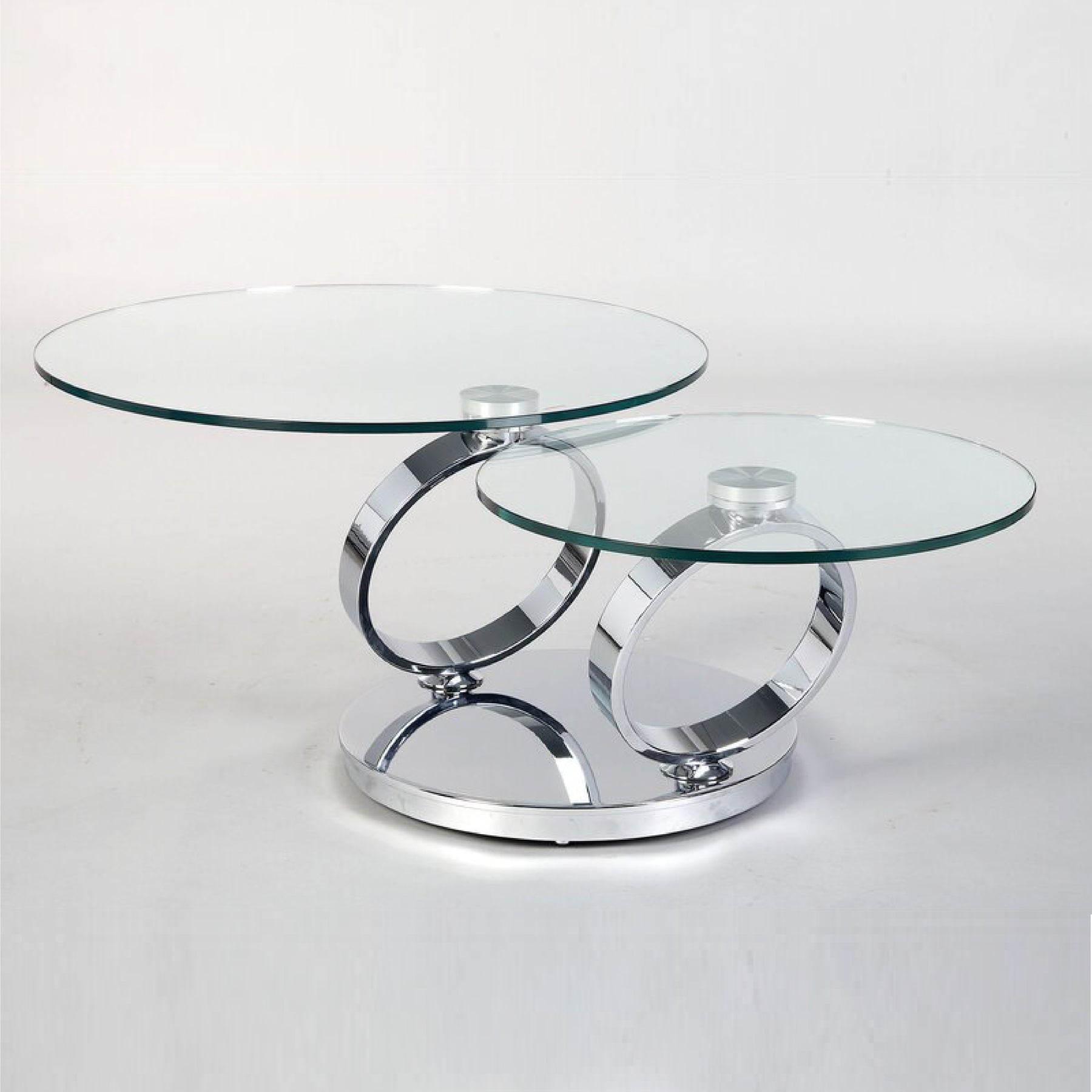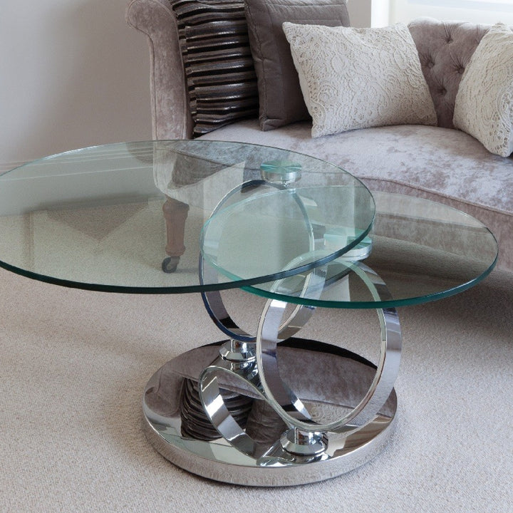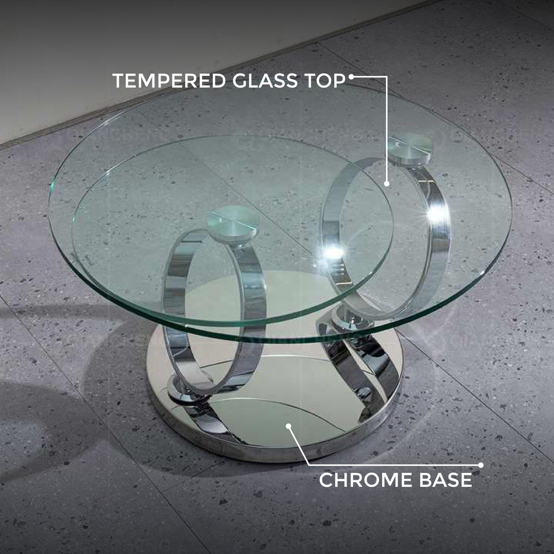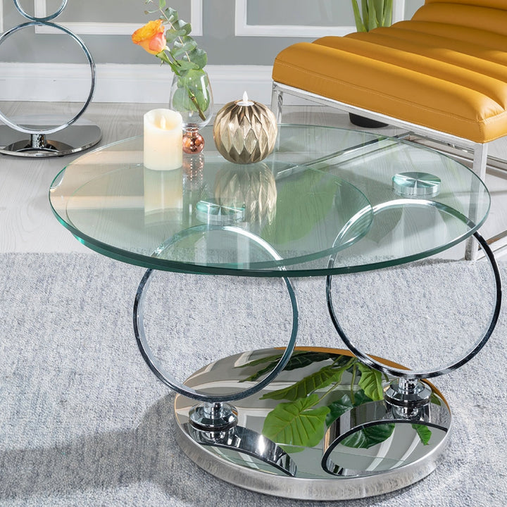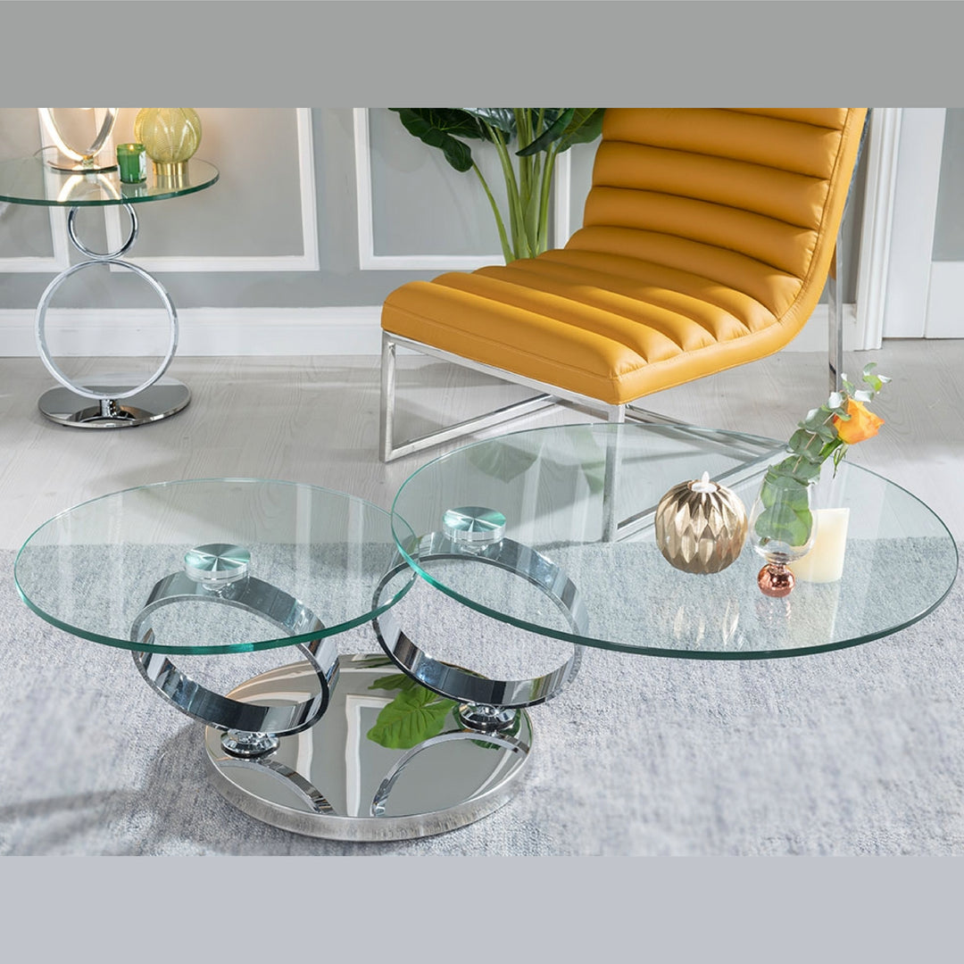 The Avalanche Swivel Glass Coffee Table features two glass tops with a rotatable design, offering versatility. Contrasting the clear glass tops, the stainless steel base in chrome finish and rings design provides a polished look. This versatile round coffee table is perfect for modern interiors, offering an adaptable design.