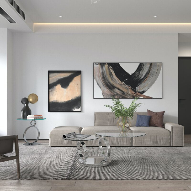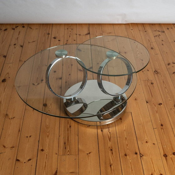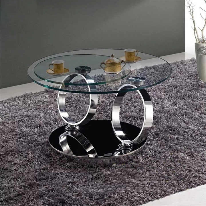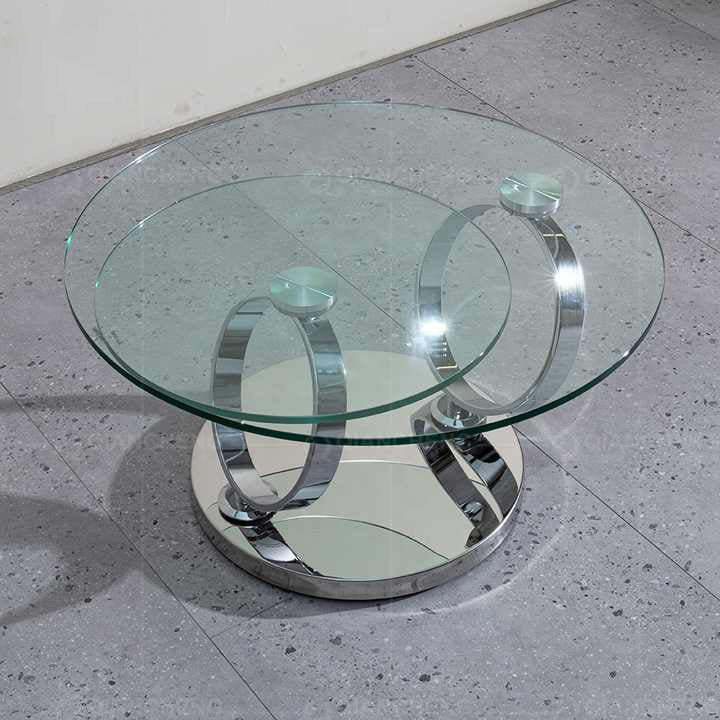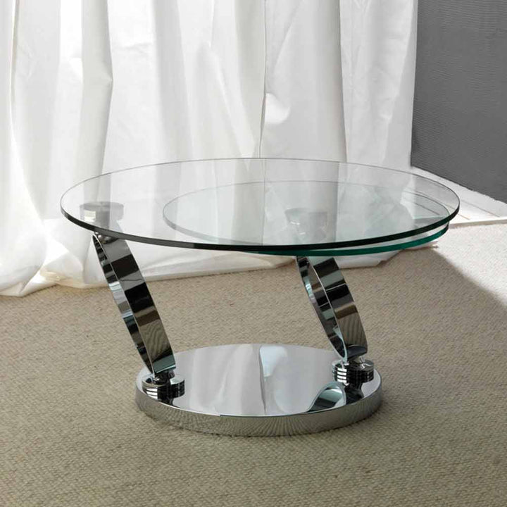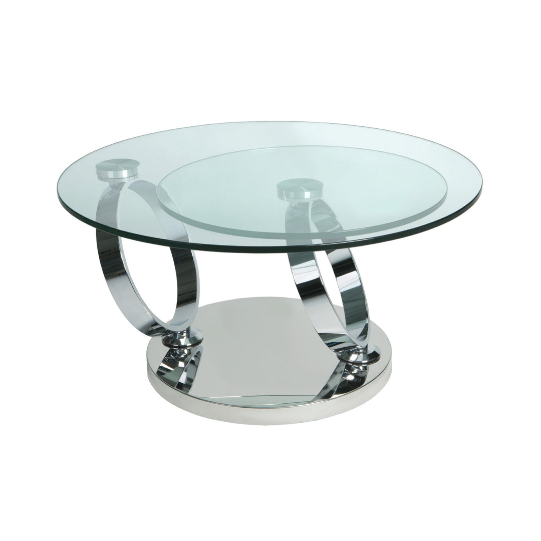 The Avalanche Swivel Glass Coffee Table features two glass tops with a rotatable design, offering versatility. Contrasting the clear glass tops, the stainless steel base in chrome finish and rings design provides a polished look. This versatile round coffee table is perfect for modern interiors, offering an adaptable design.