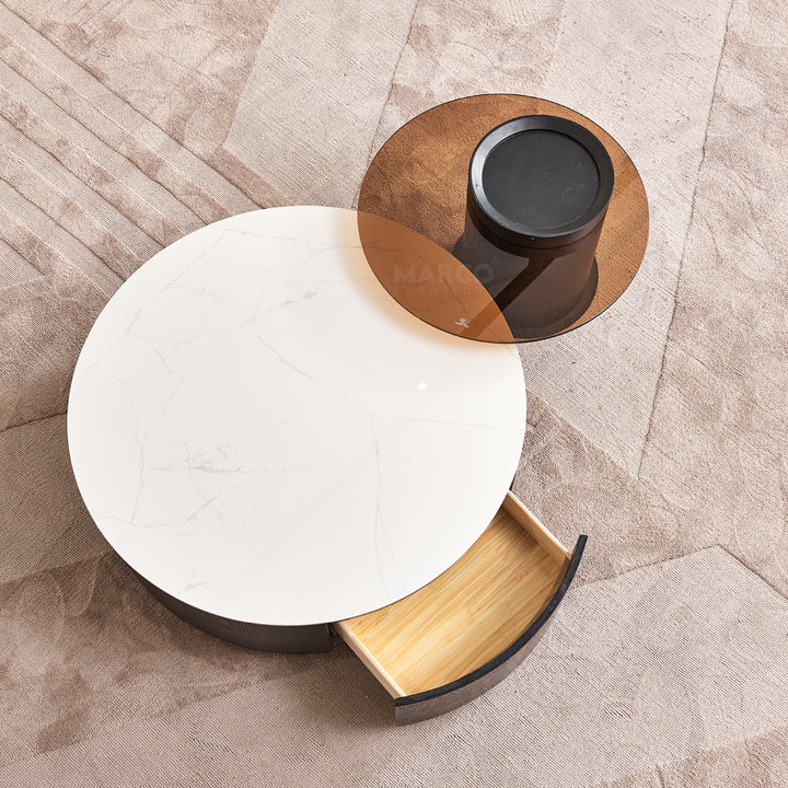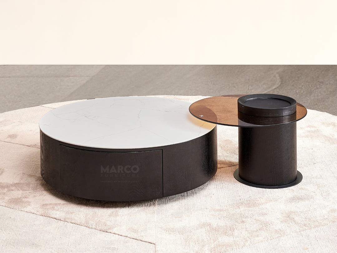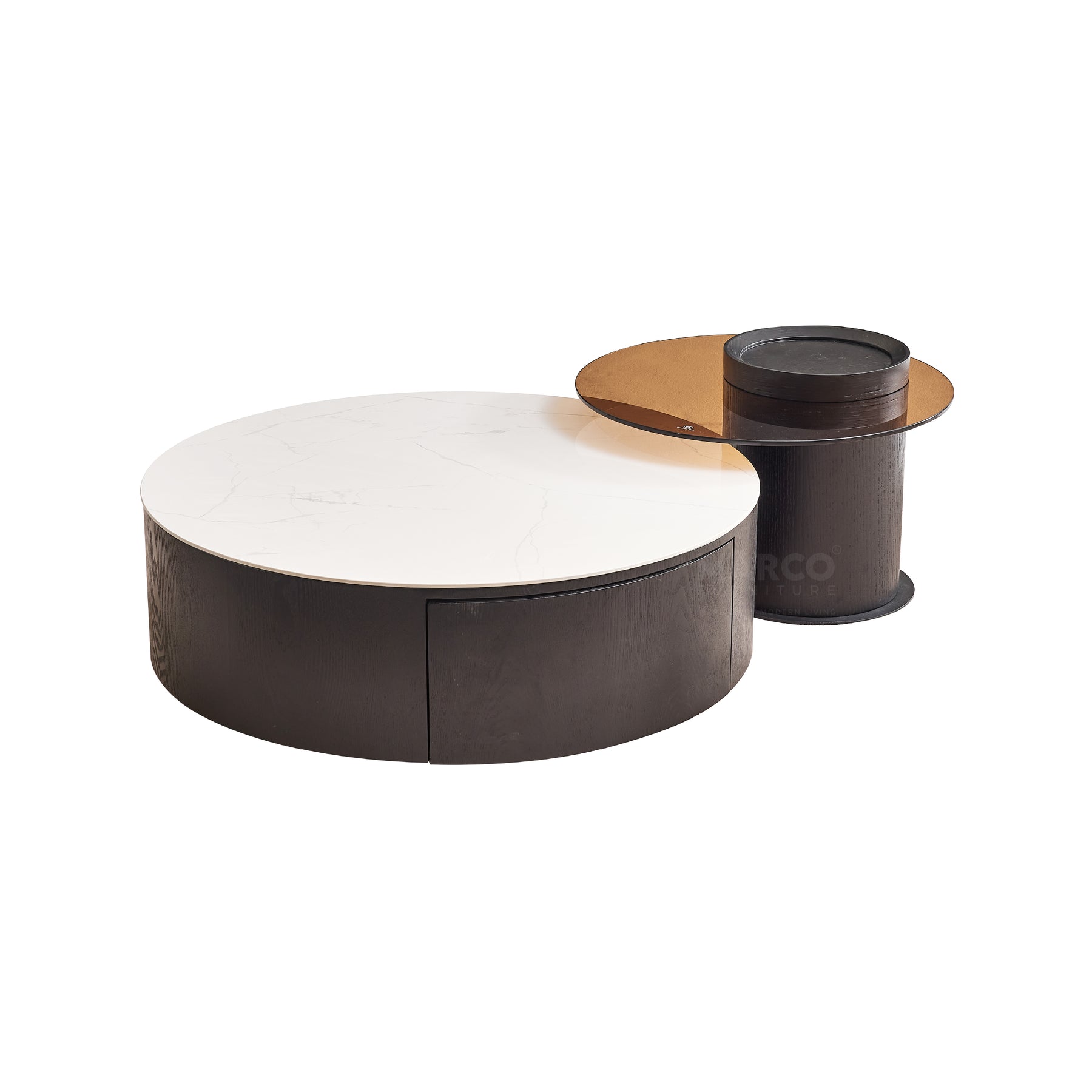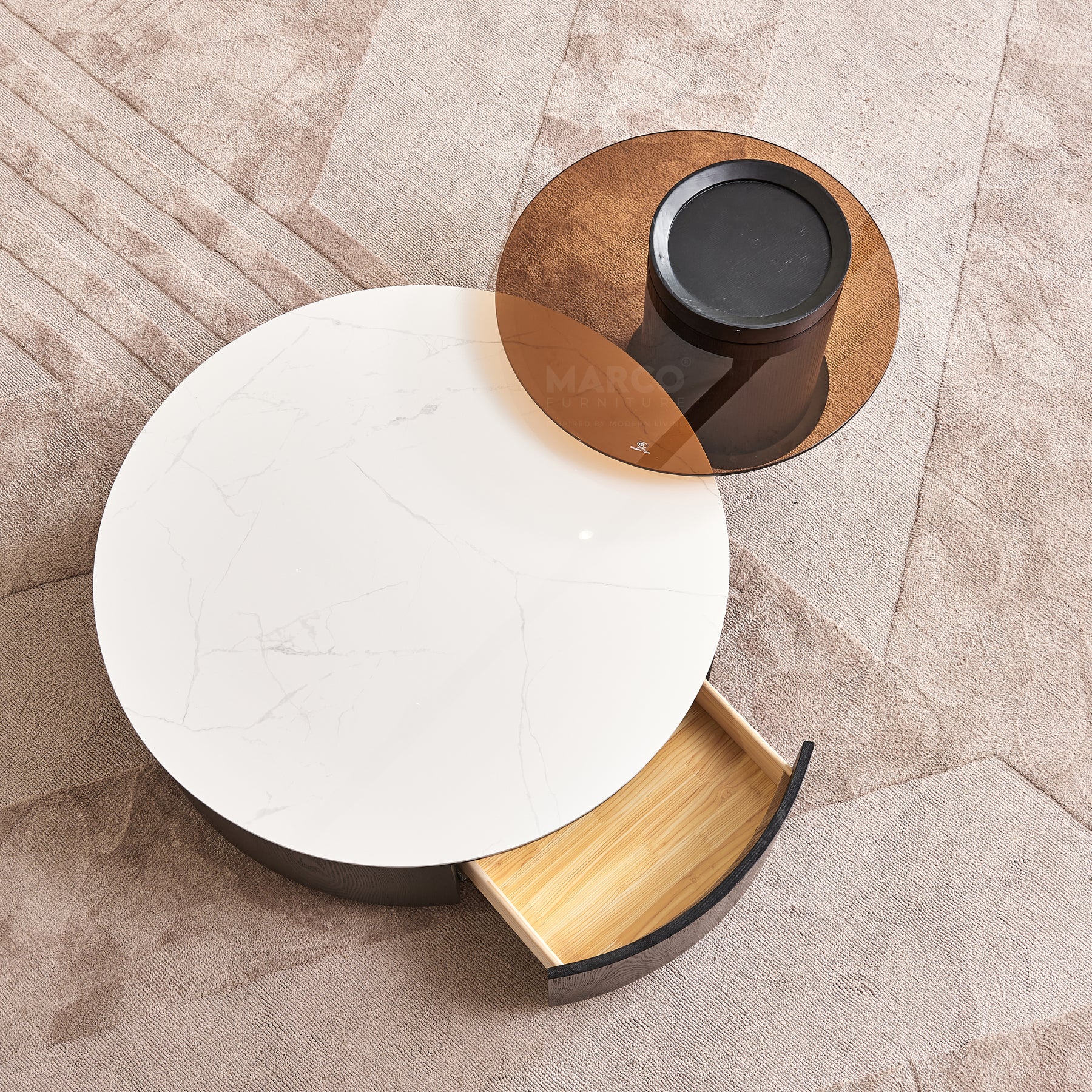 The Bahamas Round Coffee Table Set features a broad circular frame crafted from MDF, paired with a stunning round high-quality ceramic top. It includes silent wood drawers, allowing you to store your items neatly and efficiently. The side table, on the other hand, features a brown glass top, adding a retro touch to the overall design.