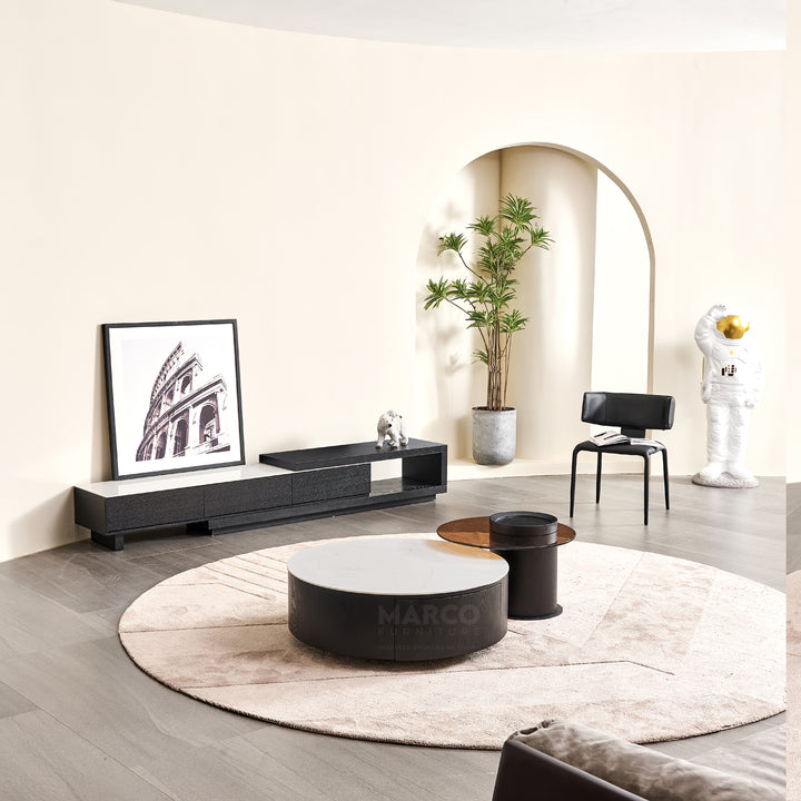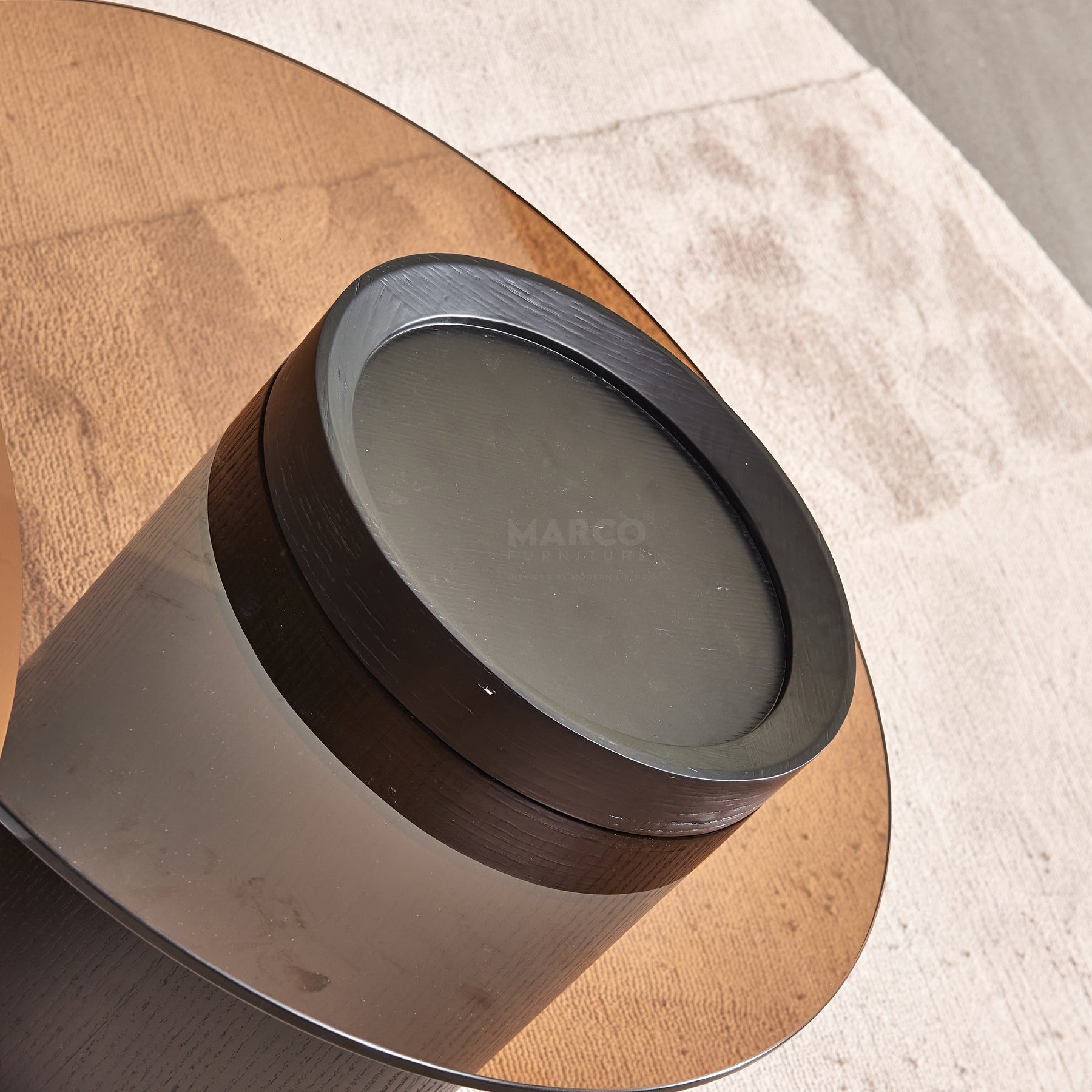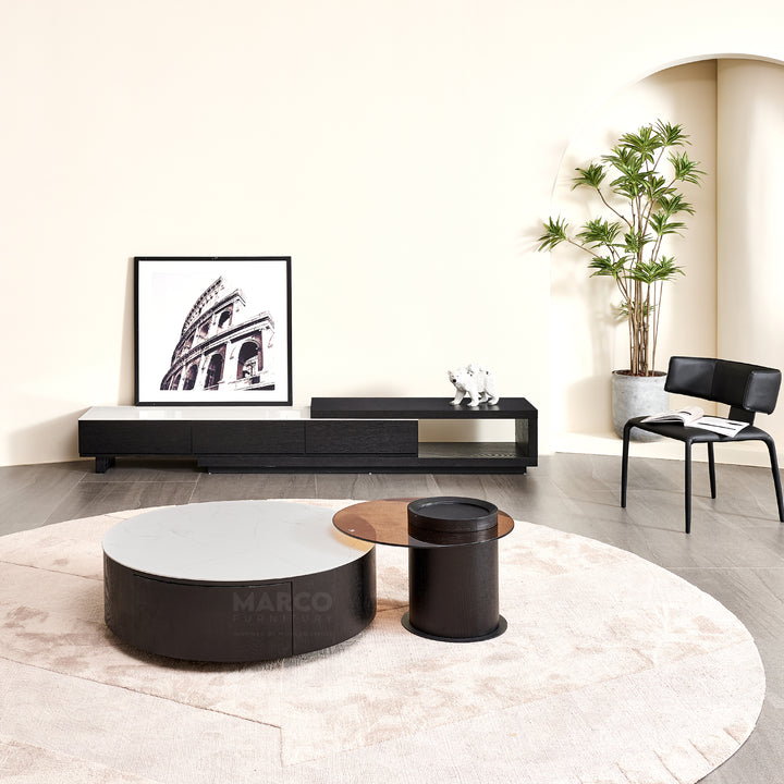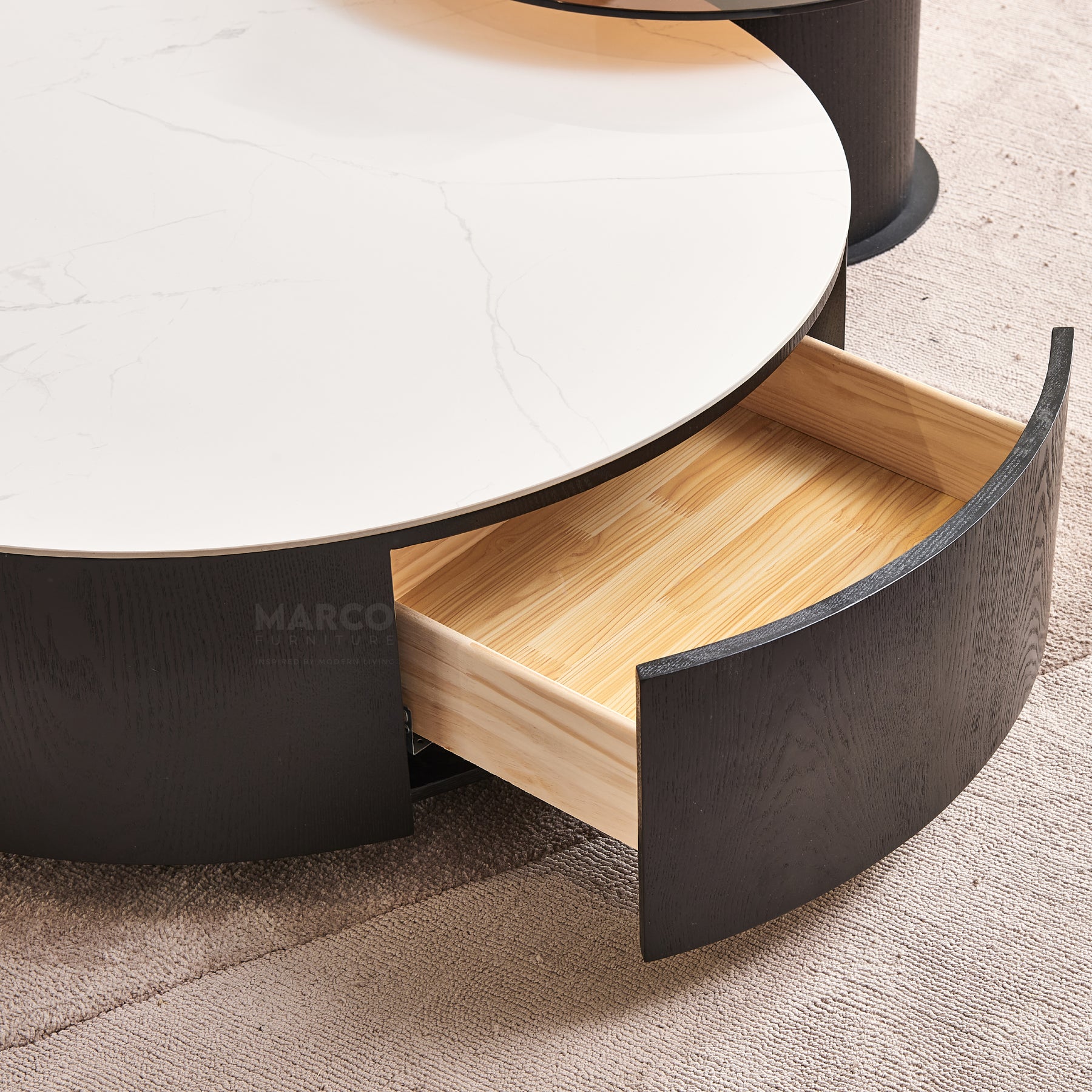 The Bahamas Round Coffee Table Set features a broad circular frame crafted from MDF, paired with a stunning round high-quality ceramic top. It includes silent wood drawers, allowing you to store your items neatly and efficiently. The side table, on the other hand, features a brown glass top, adding a retro touch to the overall design.