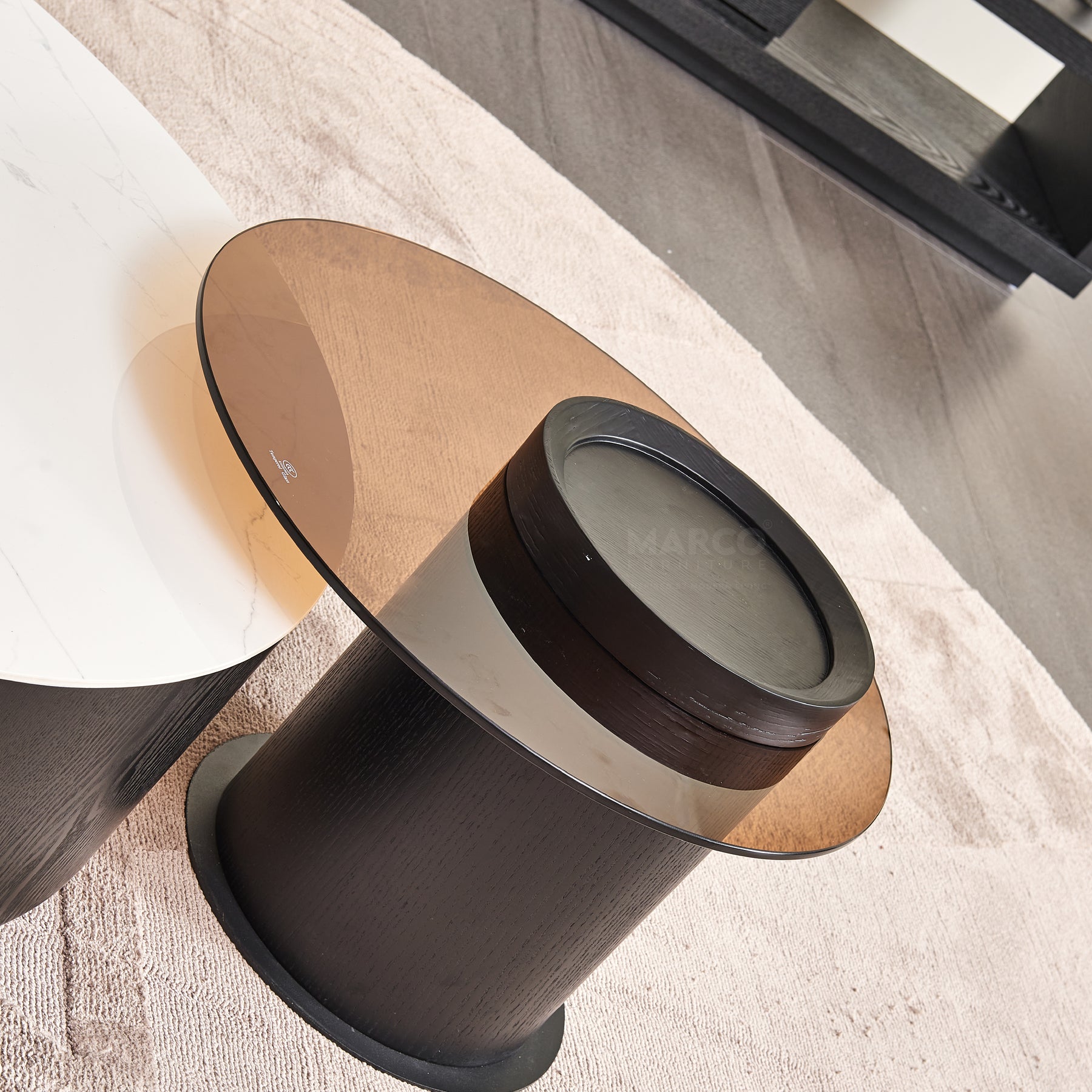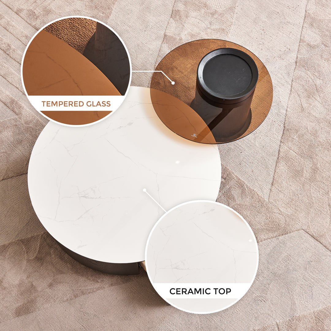 Set of Round Coffee Table with Ceramic Top and Side Table with Glass Top