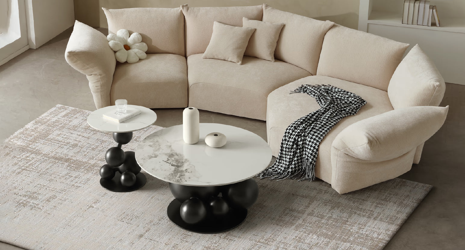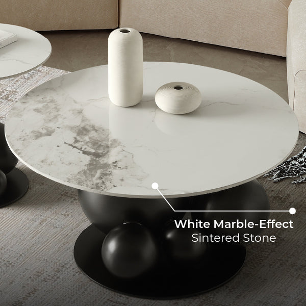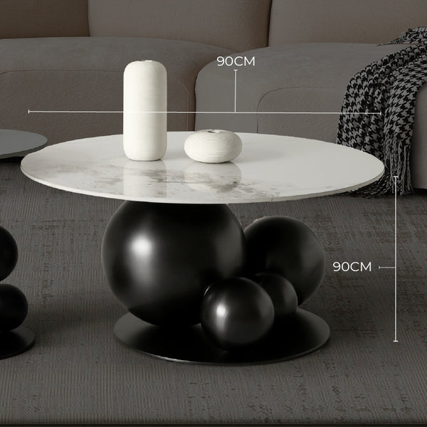 The Bruno Coffee Table Set features a striking sculptural base made from premium stainless steel, finished in a smooth black tone. Its artistic spherical cluster design creates a bold modern look, while the marble-effect sintered stone top offers a practical and stylish surface for décor and everyday use. This contemporary set serves as a standout focal point for any living space.