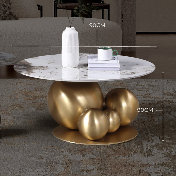 The Bruno Coffee Table Set features a striking sculptural base of organic golden spheres crafted from premium stainless steel with a lustrous gold finish. The elegant marble-look sintered stone top provides a sophisticated surface for decor and daily essentials, making this contemporary piece a captivating focal point that transforms any living space.