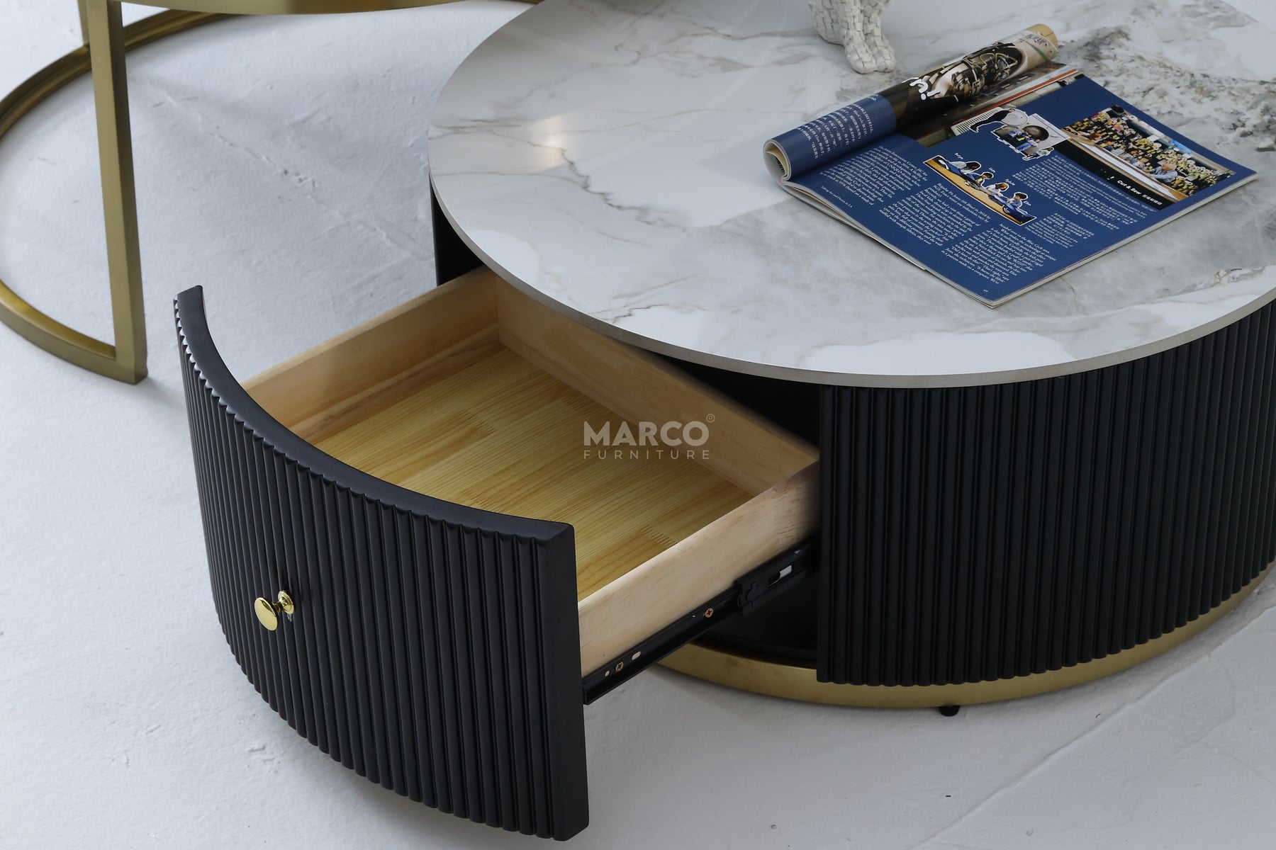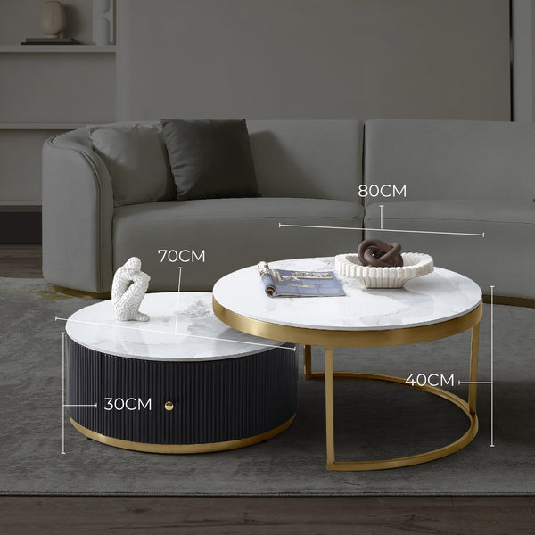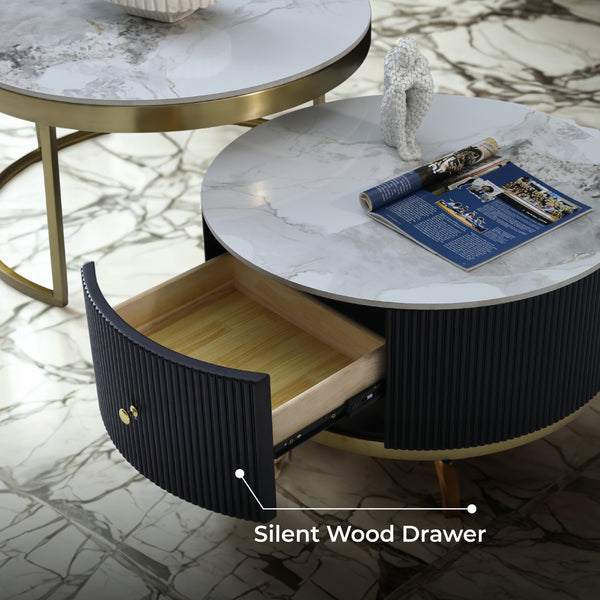 The lower table stands out with a fluted black base and hidden storage, adding character and function in one smart detail. Together, the set layers beautifully — perfect for styling books, décor, or a quiet cup of coffee.