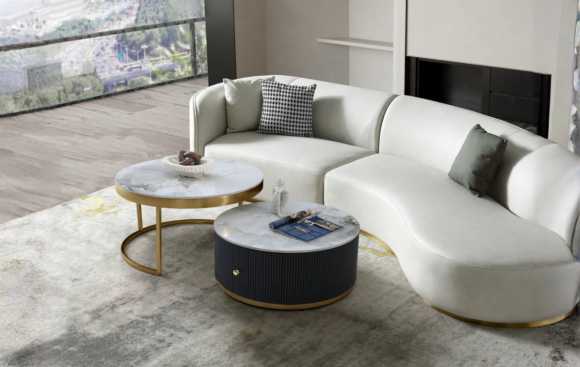 The Doyle Nesting Coffee Table Set brings a modern balance of texture and shape to your living space. The smooth white sintered stone tops rest on gold stainless steel frames that add a warm, refined touch without being flashy.