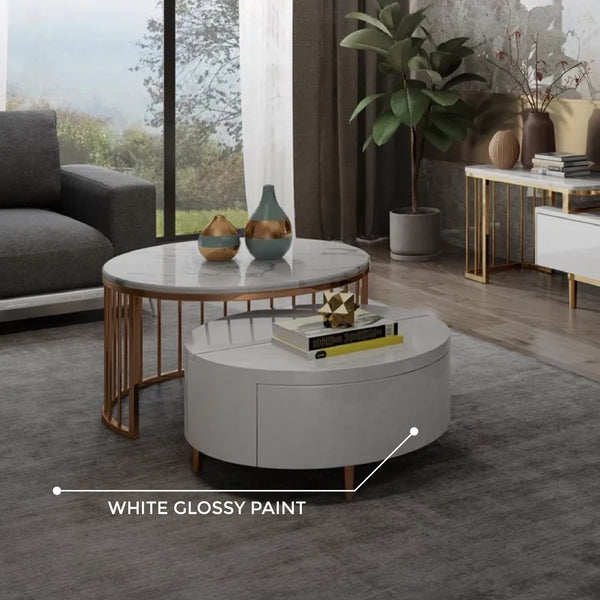 Finished in high-gloss paint, this nesting coffee table exudes luxurious appeal, also making it look clean.