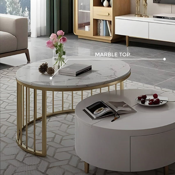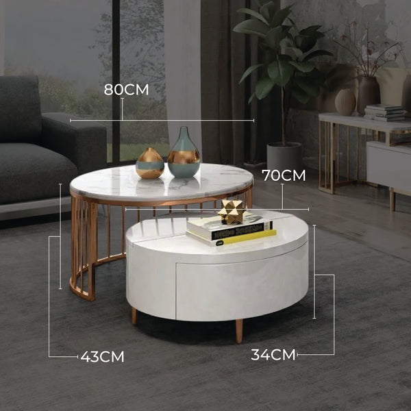 The Two-Piece Milan Nesting Coffee Table Set offers a versatile space to showcase decor or serve coffee. It comes with a round coffee table made from MDF with a white high-gloss finish and gold legs. This coffee table pairs with a matching side table, featuring a marble top and a ribbed gold cage-style base.