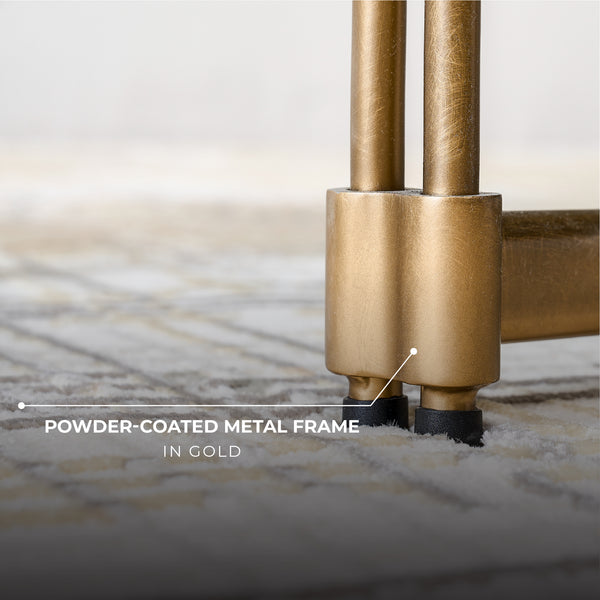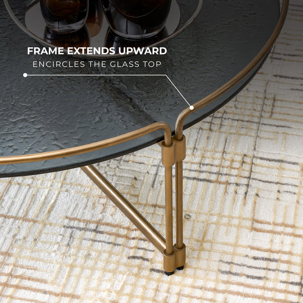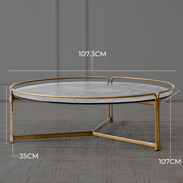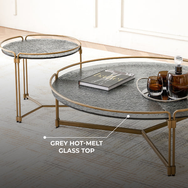 The Copenhagen Ripple Glass Top Coffee Table adopts a unique design that brings grace to modern living spaces. The grey ripple glass top of this round coffee table features a textured surface, bringing it a visual depth. Its powder-coated gold metal base is not only sturdy but also designed to draw attention.