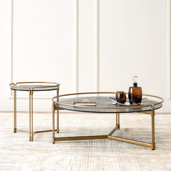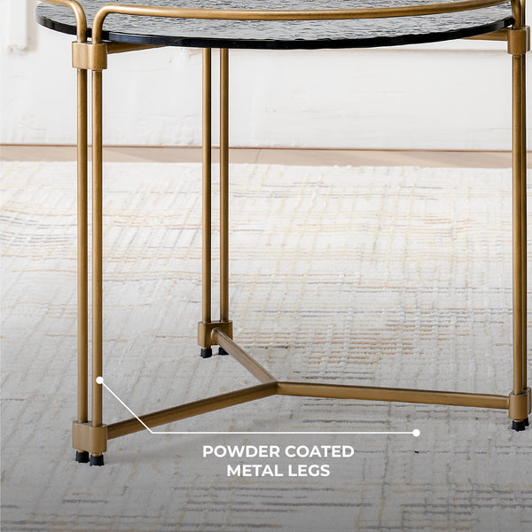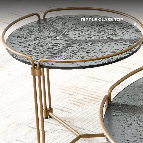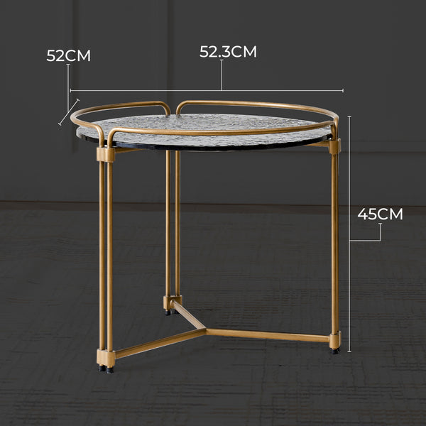 The Copenhagen Collection features a contemporary end table. With its grey ripple glass top, this side table harmonizes with industrial and modern living rooms. The base contrasts with the grey glass top, made from metal and finished in gold, creating a regal combination.