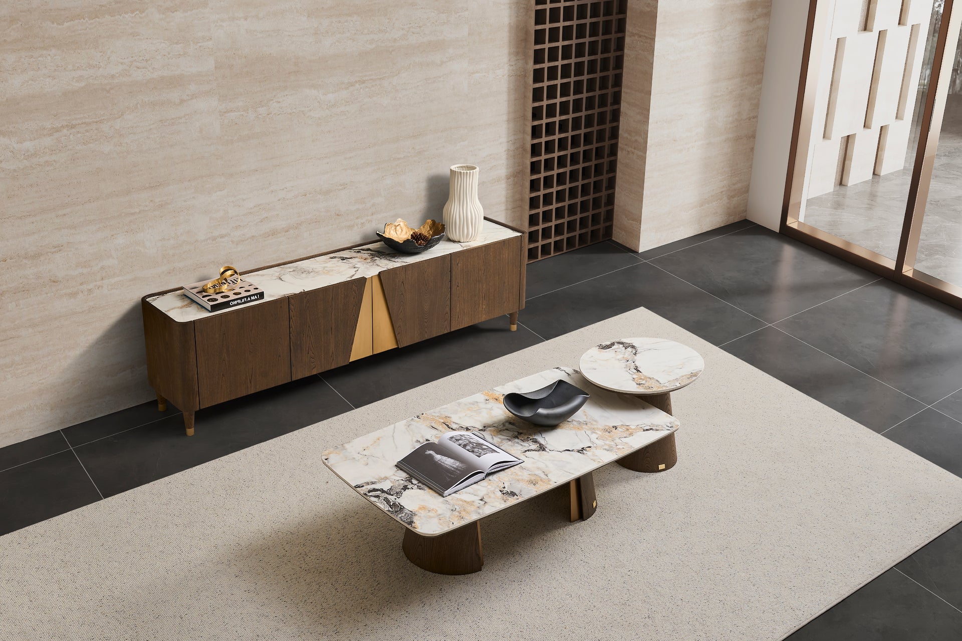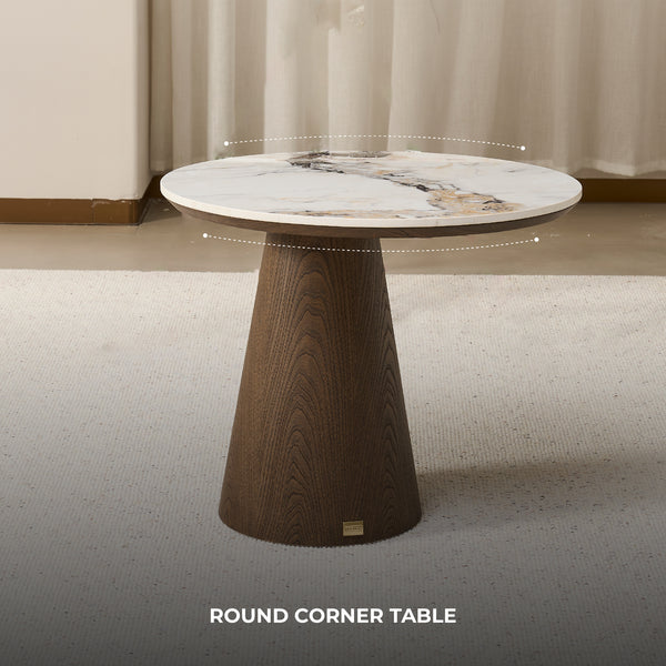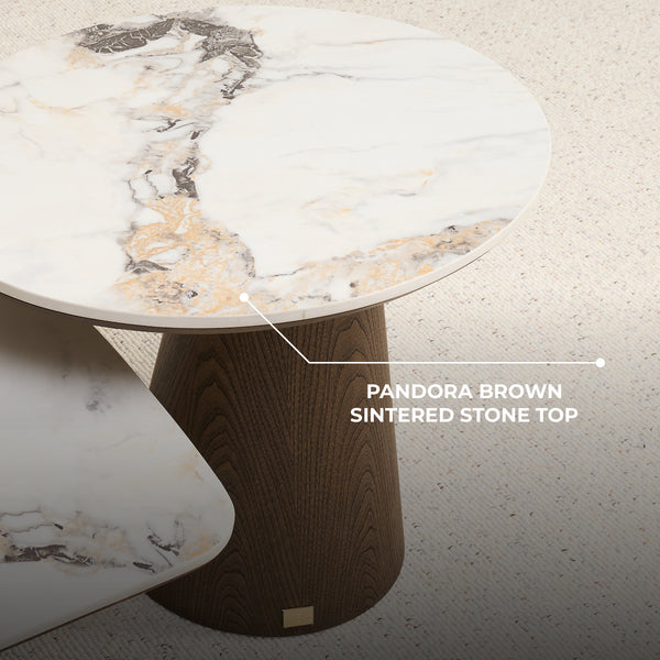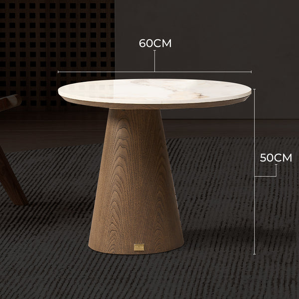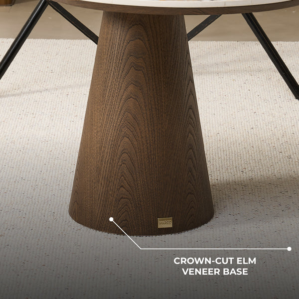 The Olmo Fiorito End Table is designed for luxury living rooms. Its tabletop is made from a glossy sintered stone, featuring natural gold and black veining. The top is supported by a cone-shaped base, made from crown-cut elm veneer, which shows a natural grain pattern. This corner table provides a stable surface for table lamps, drinks, or placing remote controls within easy reach.