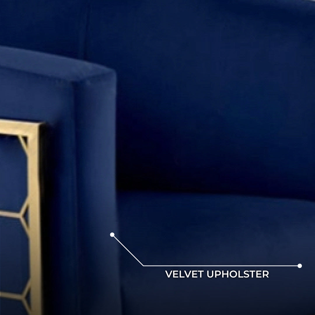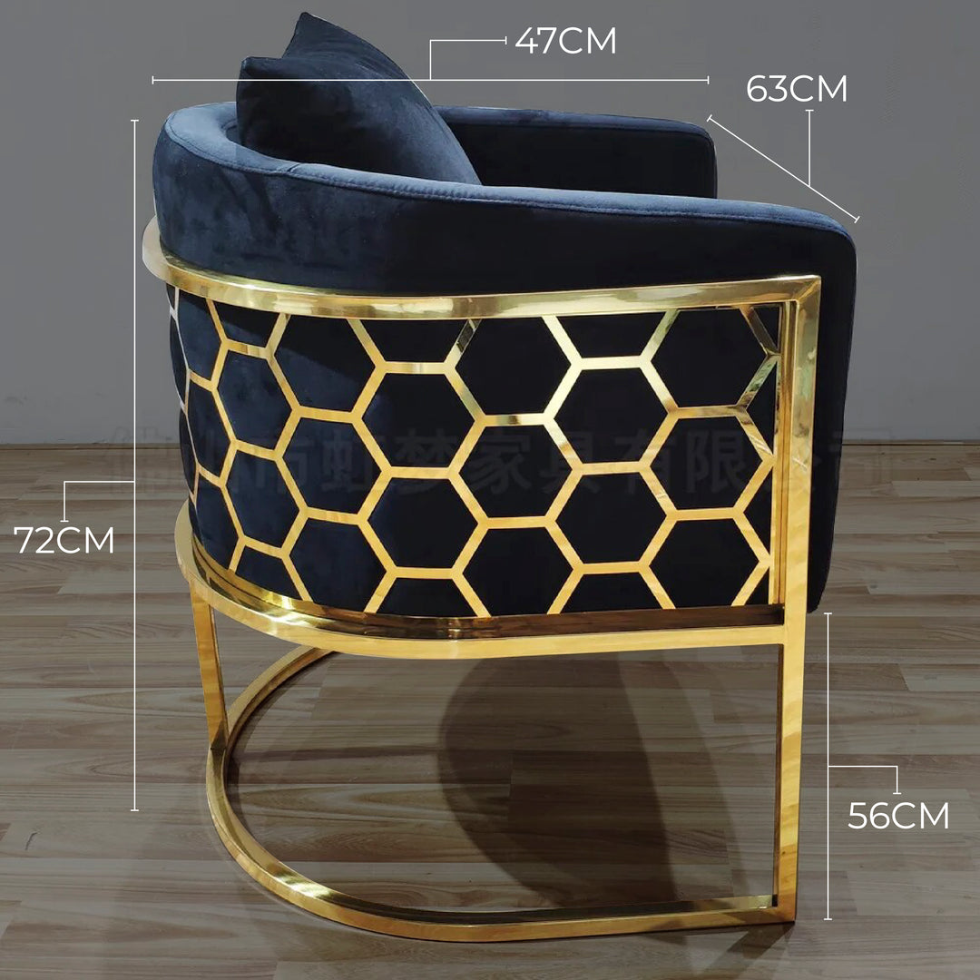The Honeycomb Dining Chair is renowned for its unique honeycomb-designed back with a brushed gold finish that makes it even more appealing. Adding luxury to its appearance, the blue velvet upholstery offers comfort. This chair lasts for years with its strong stainless steel legs with brushed gold and a unique curved pedestal.