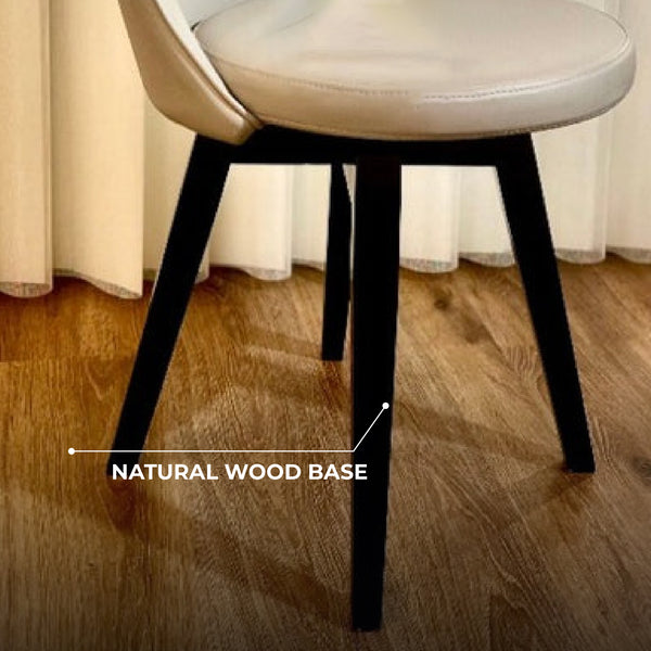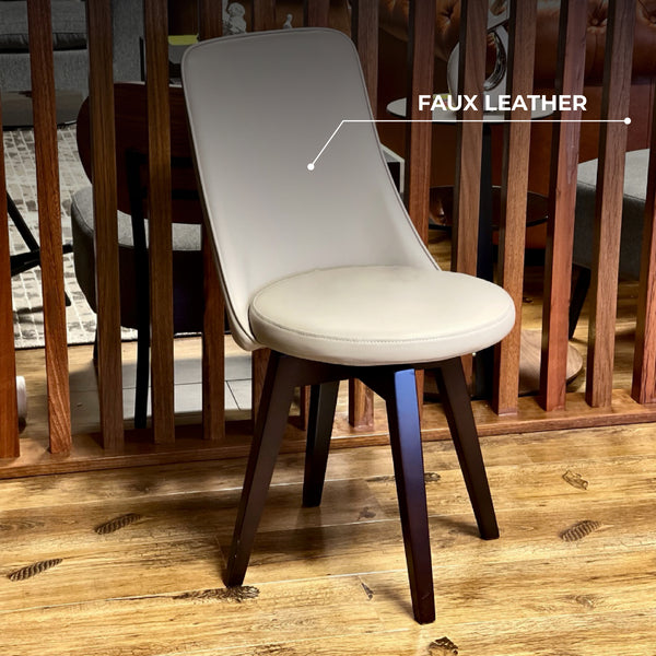The Polo Leather Swivel Dining Chair is a contemporary-style chair featuring a clean design. This modern dining chair is crafted from high-quality faux leather, making it a comfortable seat. Complemented with strong rubber wood legs with a dark walnut finish, this chair makes a perfect addition to any dining table style.
