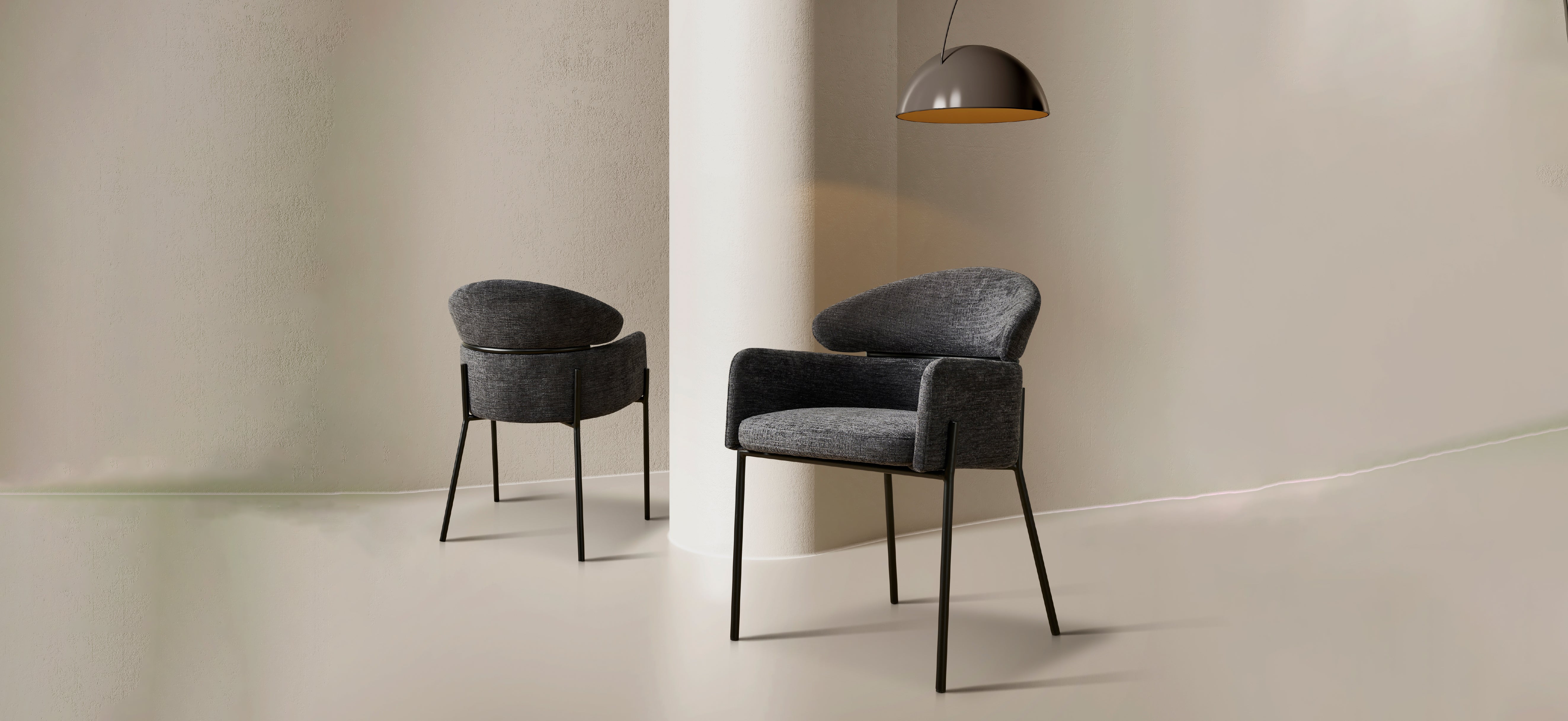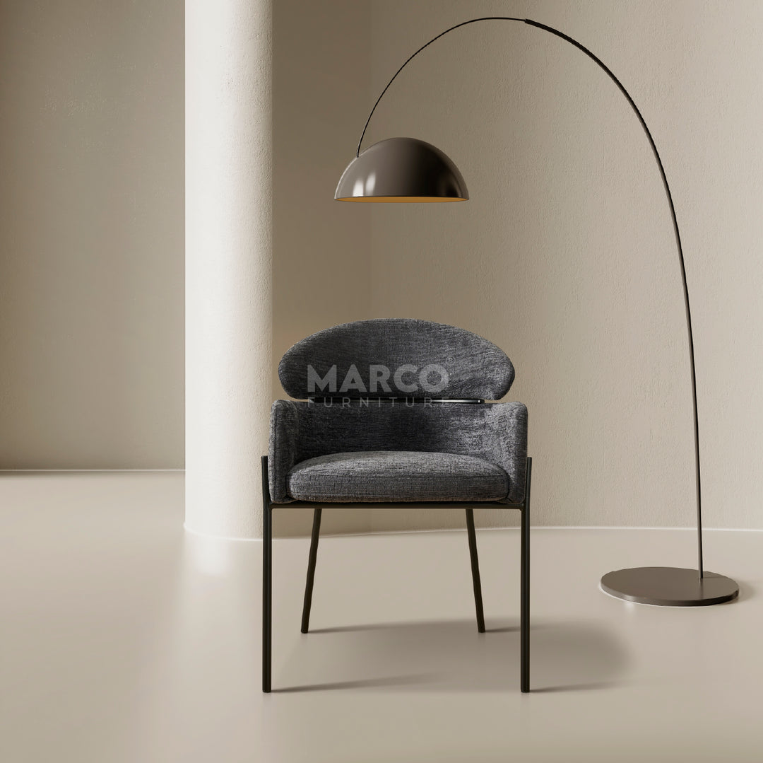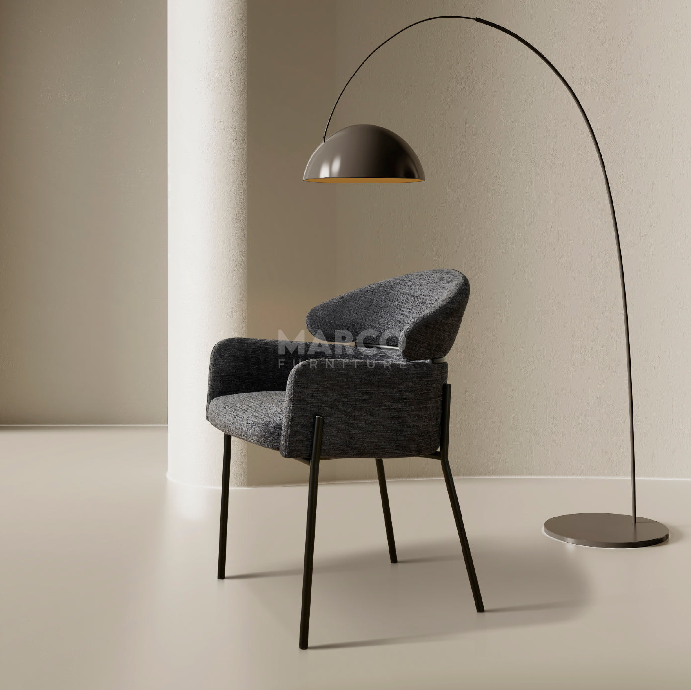The Hallie Fabric Dining Chair showcases a barrel-style design with a comfortable curved backrest. Upholstered in high-quality textured fabric, its graphite colour offers it a rustic appeal. The traditional splayed metal legs in a matte black finish provide sturdy support while exuding a touch of royal allure.