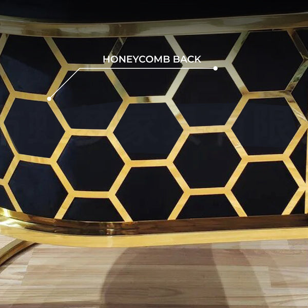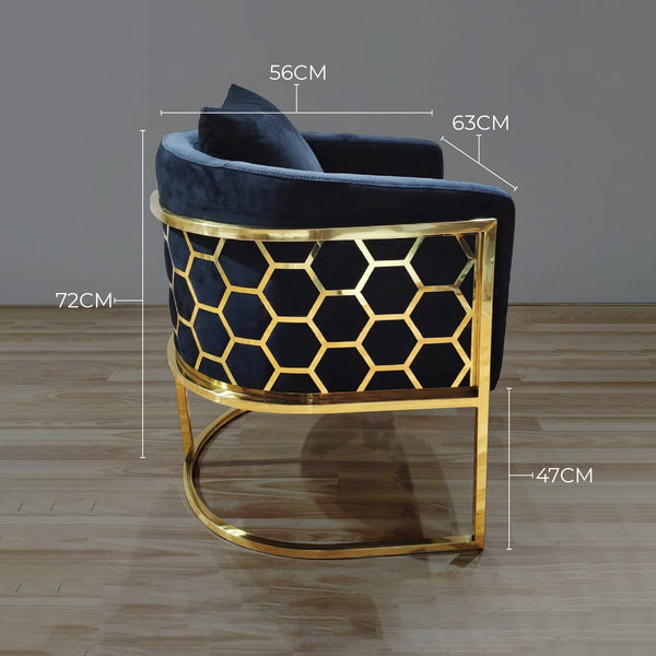 The Honeycomb Velvet Armchair reflects a regal and aristocratic charm. Featuring a unique honeycomb back design with a gold sheen, this chair is ideal for royal-inspired living spaces. Draped in luxurious black velvet, the armchair combines comfort with a rich and sophisticated texture.