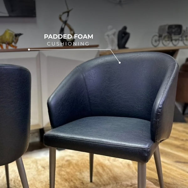 The Leo modern dining chair offers lasting comfort with its premium Faux leather upholstery. The black leather seat is paired with carbon steel legs finished in black. This dining chair comes with padded foam seating for optimal comfort.