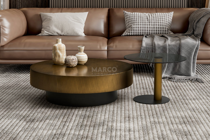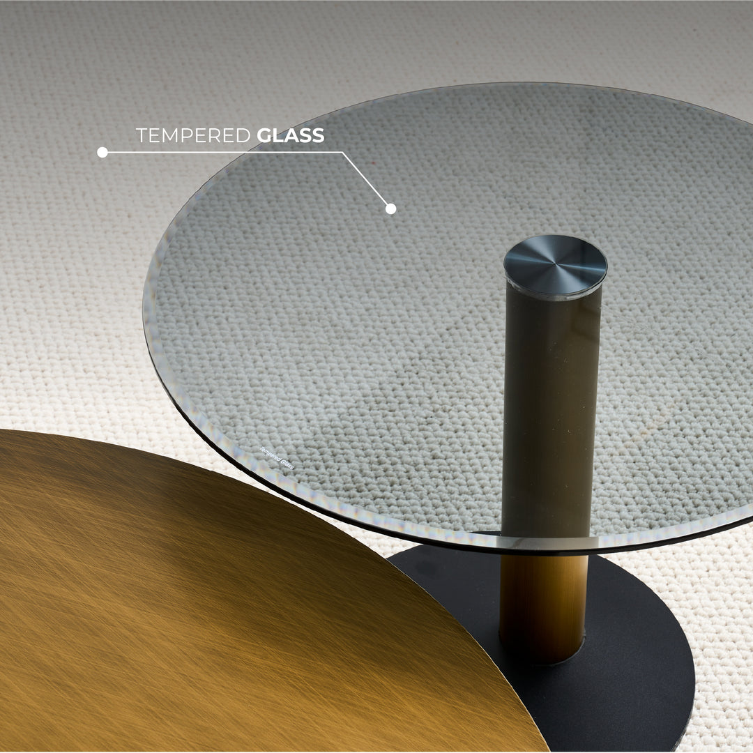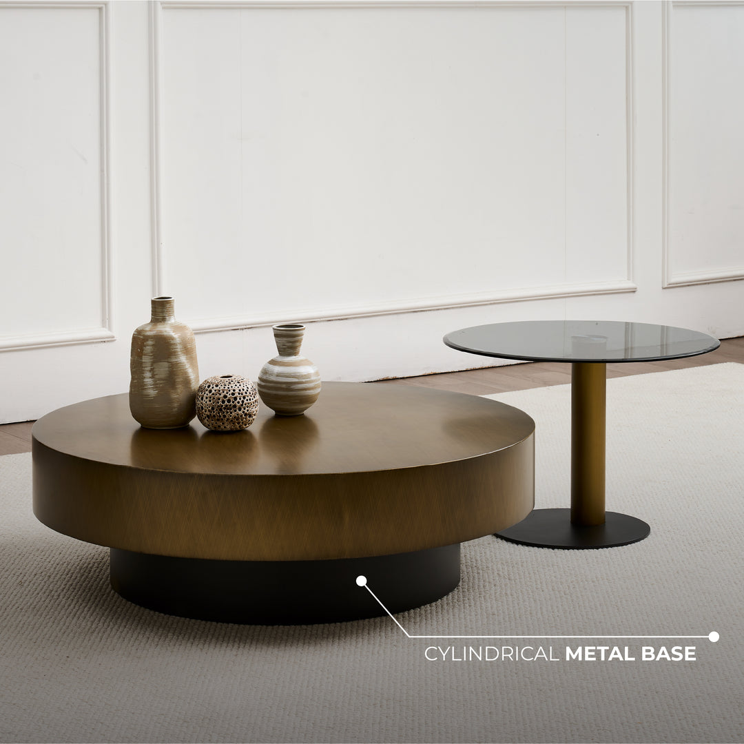 The Cassidy Nesting Coffee Table Set features a broad cylindrical metal base in black finish and a bronze metallic table top. It comes with a smaller tempered glass top side table with a bronze stand and black metal baseplate. This Cassidy Coffee Table Set is an accent piece for any living space.