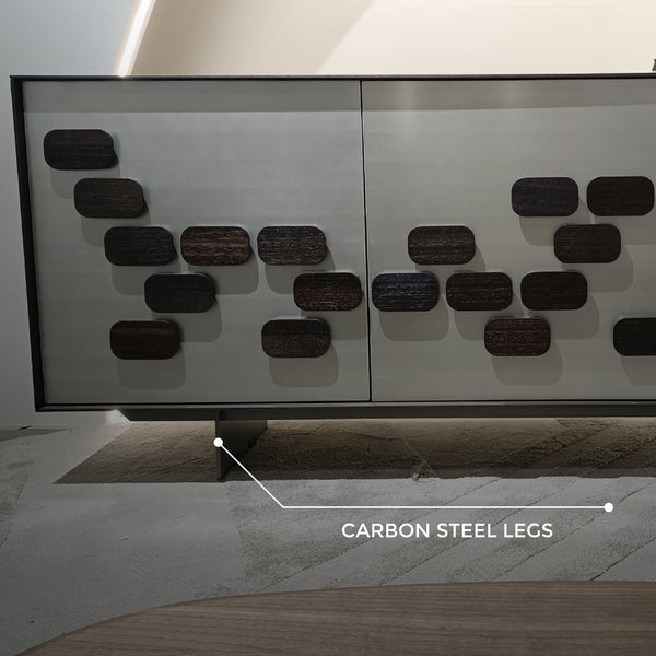 The Castilla Sideboard exudes natural charm, crafted with high-quality Eucalyptus veneer and supported by durable carbon steel legs. Its 3 piano paint finished cabinet doors open to reveal storage space, perfect for organising your living and dining room essentials.