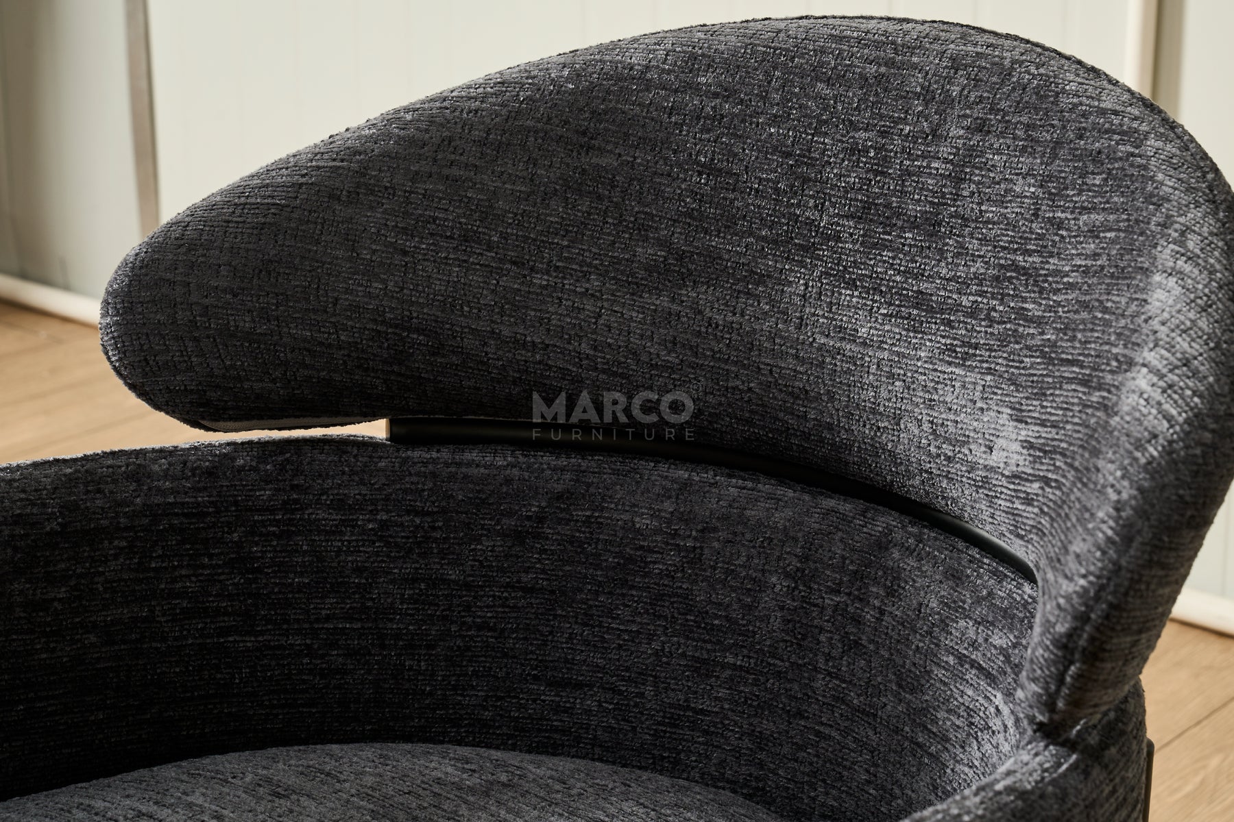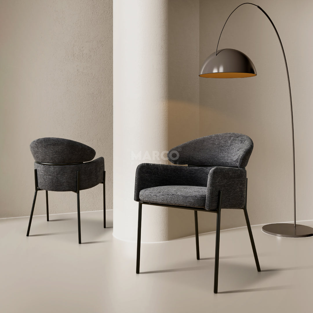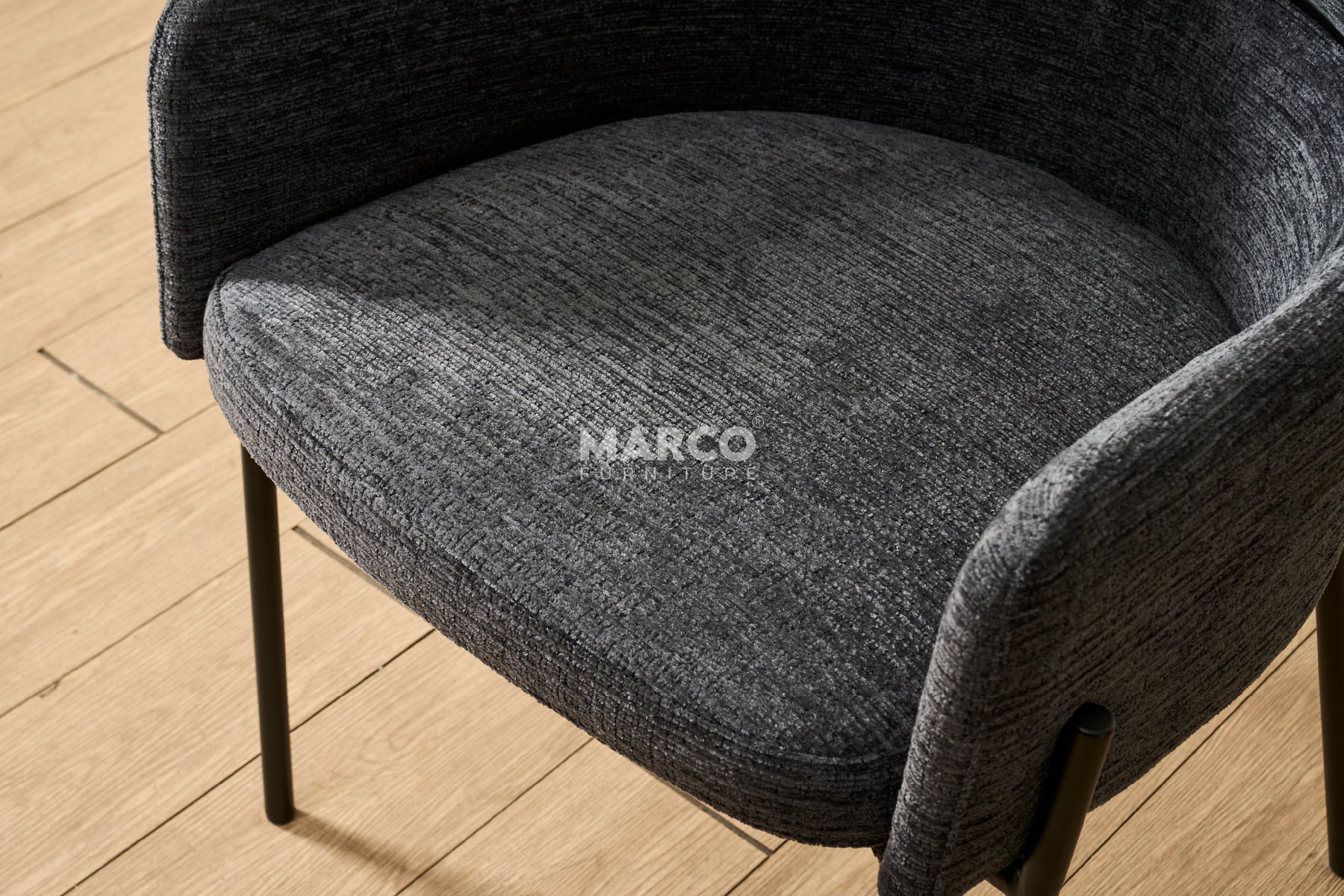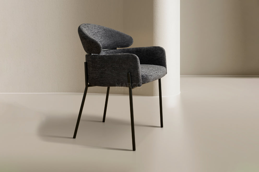 The Hallie Fabric Dining Chair showcases a barrel-style design with a comfortable curved backrest. Upholstered in high-quality textured fabric, its graphite colour offers it a rustic appeal. The traditional splayed metal legs in a matte black finish provide sturdy support while exuding a touch of royal allure.