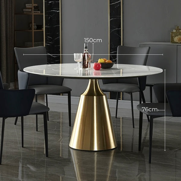 The Amara Pedestal Marble Dining Table brings a modern edge to your dining room. Its round marble top features unique veining, offering both visual appeal and long-lasting quality. The round stainless steel pedestal base, finished in gold, offers sturdy support to the table in a contemporary style. It also has a non-marking ring to protect the flooring.