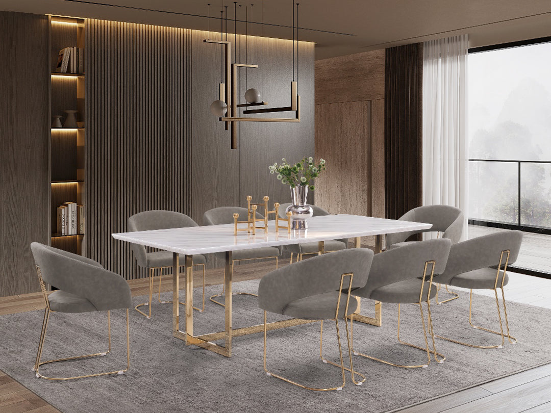The Eden Dining Table is a luxurious piece that adds royal grace to the dining room. Its 220cm x 100cm tabletop is made from designer marble which is easy to maintain. It offers plenty of room for dining, seating up to 8 people. This dining table features a champagne gold stainless steel base, creating a stylish and durable foundation.