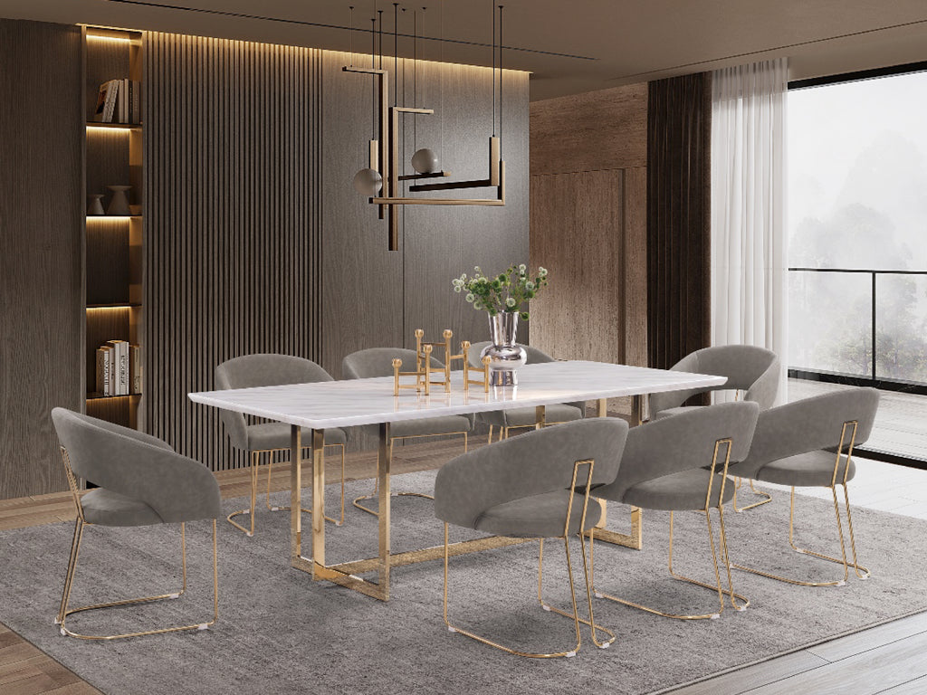 The Dublin Sintered Stone Dining Table makes a royal statement with its architectural aesthetics. This modern dining table features sintered stone top combined with glass which provides it strength and beauty. The base of this sintered stone dining table consists of an arched design, crafted from powder-coated metal with a gold finish.