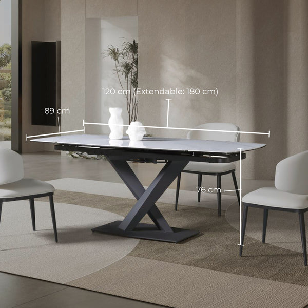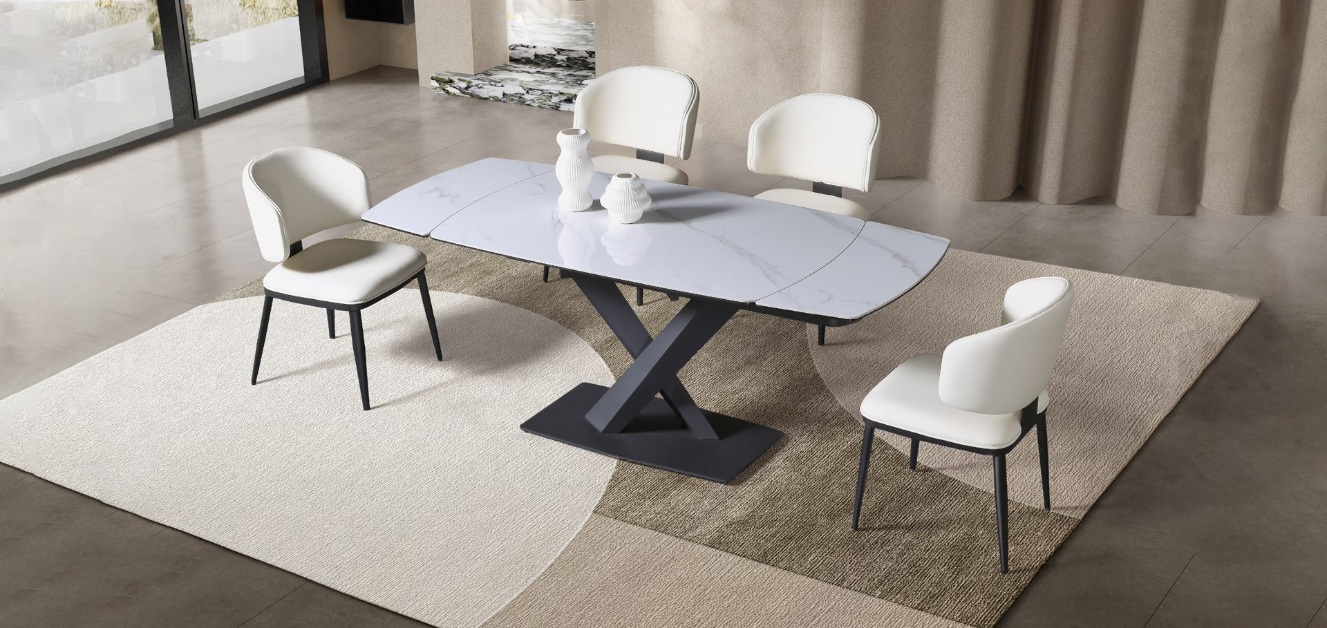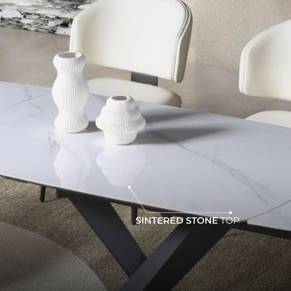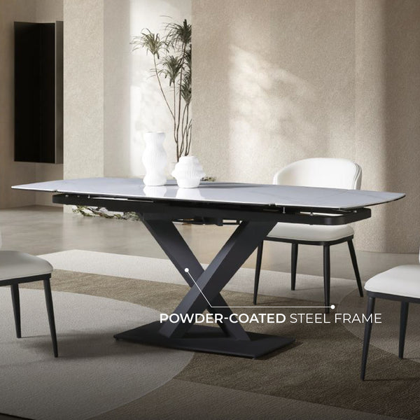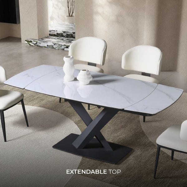The Eclipse Extendable Sintered Stone Dining Table provides a modern dining experience. Its beautiful, clean-lined white sintered stone top features a stunning yet easy-to-maintain surface. The matte black powder-coated steel frame provides a bold and sturdy foundation to this table. Equipped with a swivel mechanism, the table effortlessly adjusts to suit your needs.