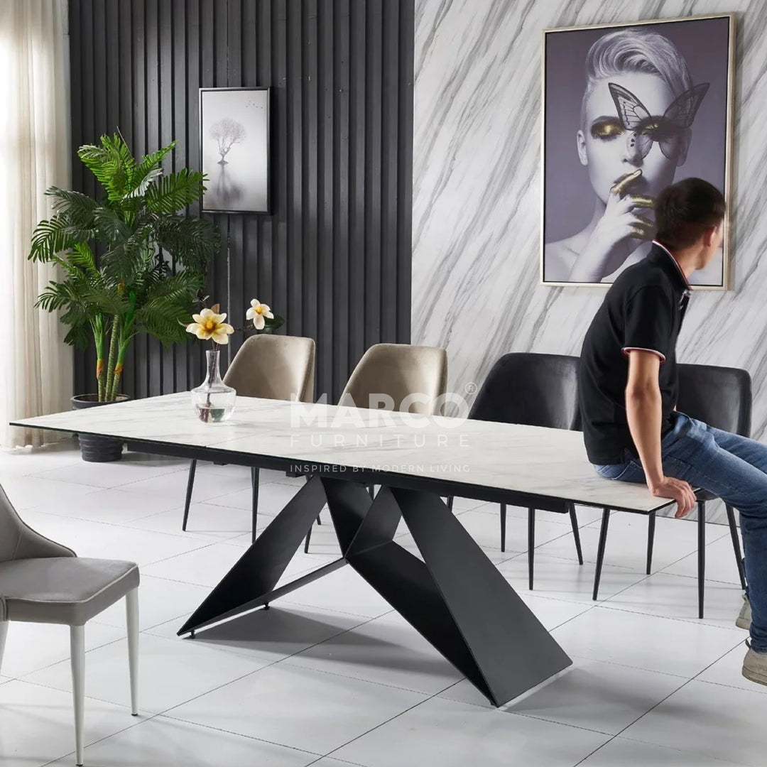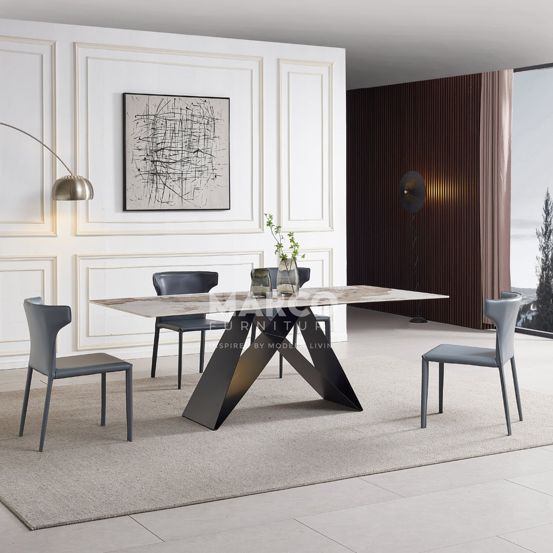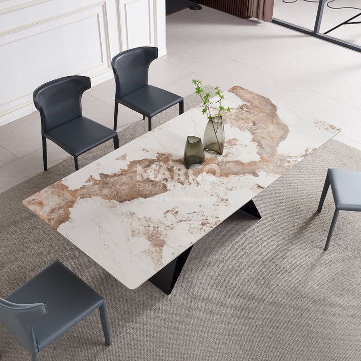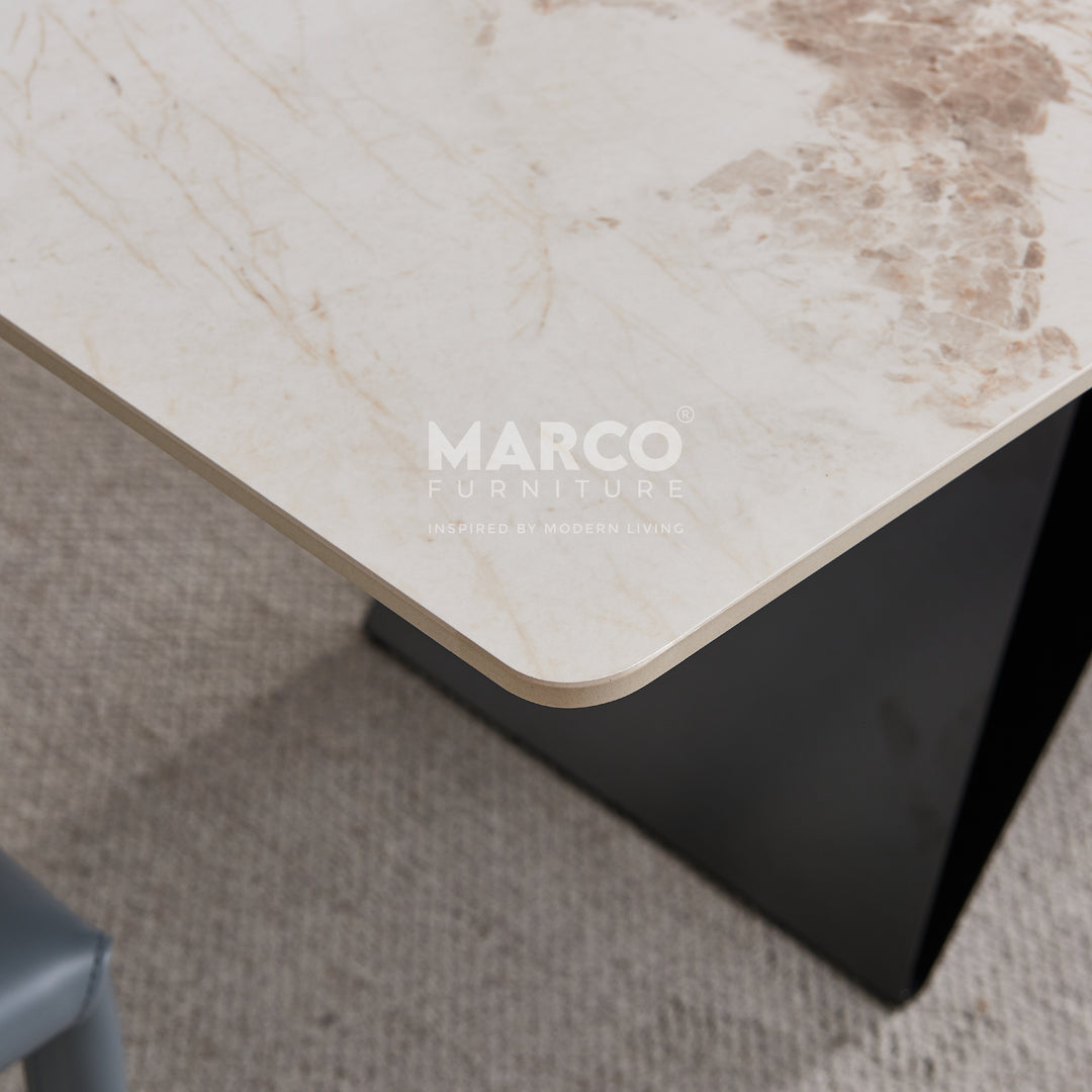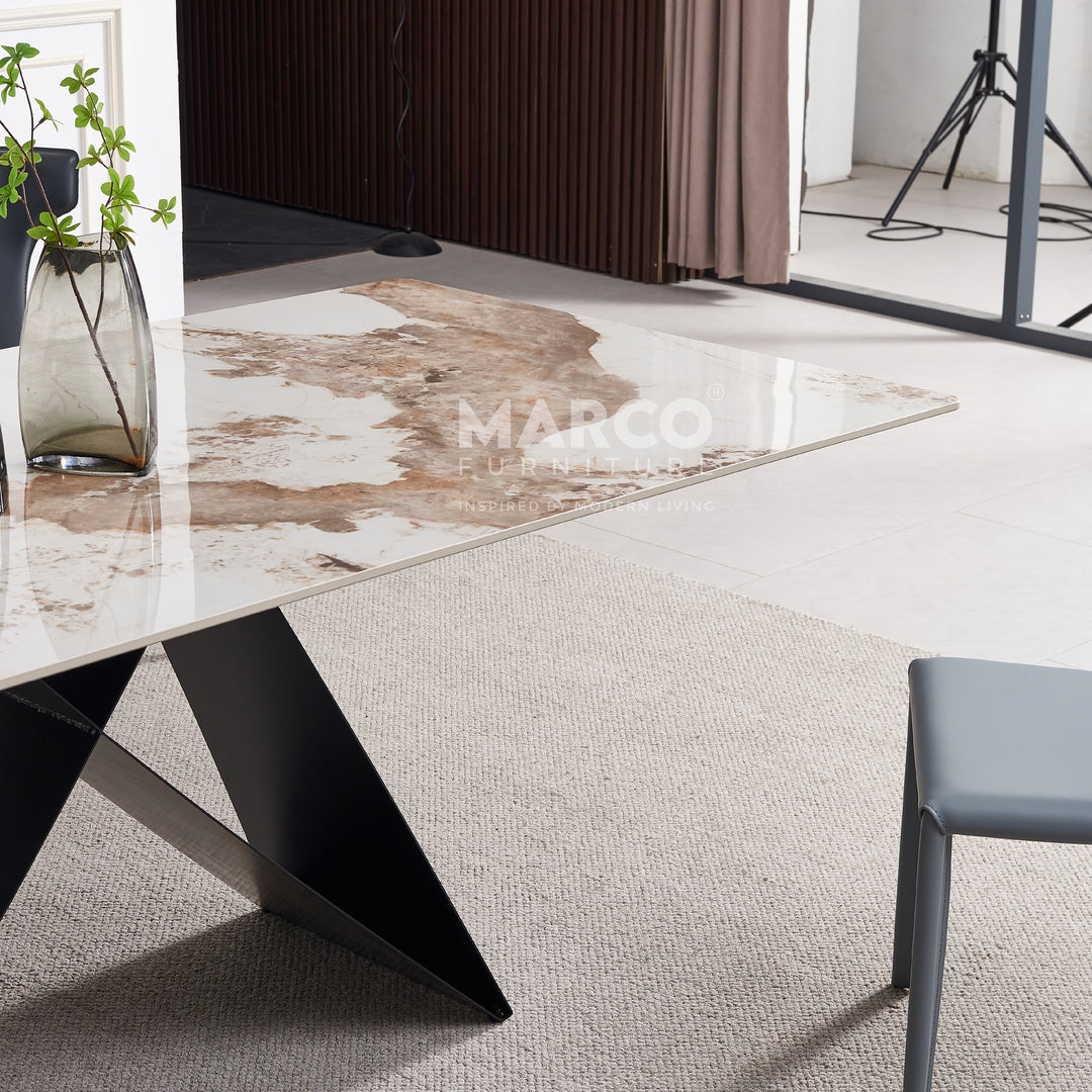 The Geneva Cattelan Style Dining Table comes in a beautiful cream-white ceramic top with natural brown veins. The gorgeous cut of ceramic serves as a spacious tabletop for everyday meals. The splayed designed base is made of metal, powder-coated in black for a matte finish. It’s perfectly suited for modern interiors and pairs beautifully with our comfortable dining chairs.